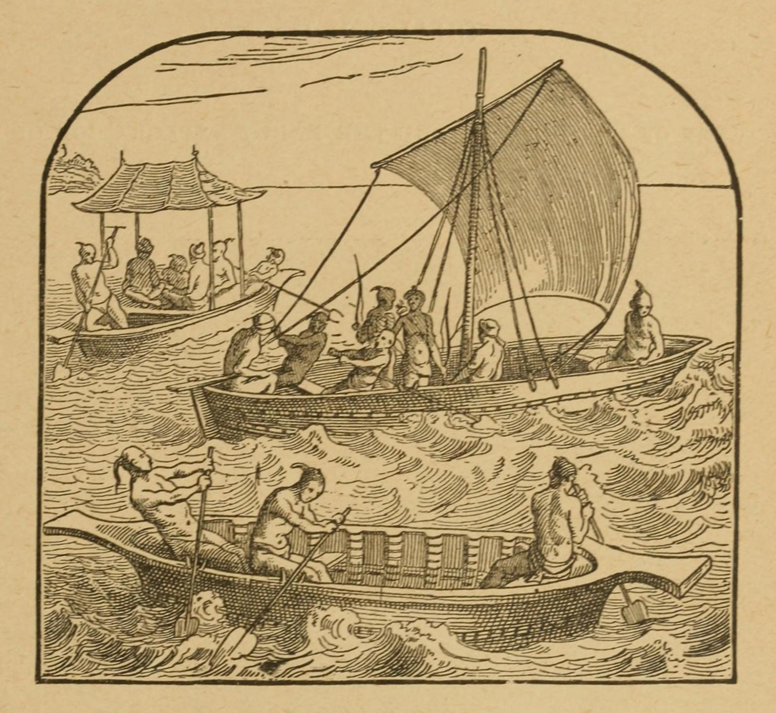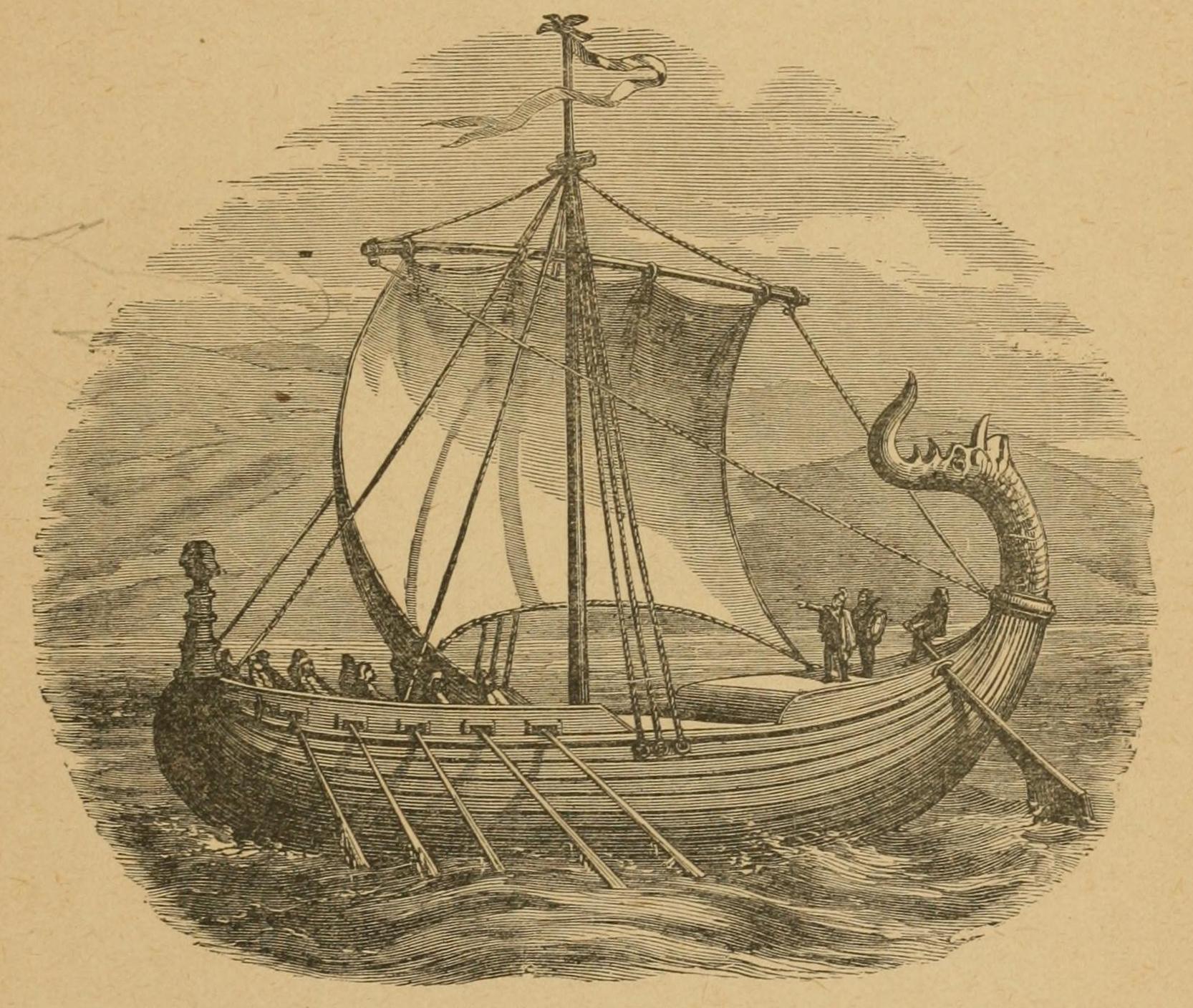 Thorvald is supposed on this trip to have coasted along the shores of Connecticut, Rhode Island, and Long Island, and in the ensuing year, 1004, to have sailed as far north as Cape Cod (N. lat. 42° 5′, W. long. 70° 10′), where he was wrecked in a violent storm. His vessel was not, however, materially damaged, and having repaired it, he coasted along the present Massachusetts till he came to what is now the harbor of Boston. There he landed, and wandering to and fro in the beautiful scenery with his men, he for the first time came upon some natives, probably Esquimaux, who were resting peaceably beneath their quaint skin-boats.