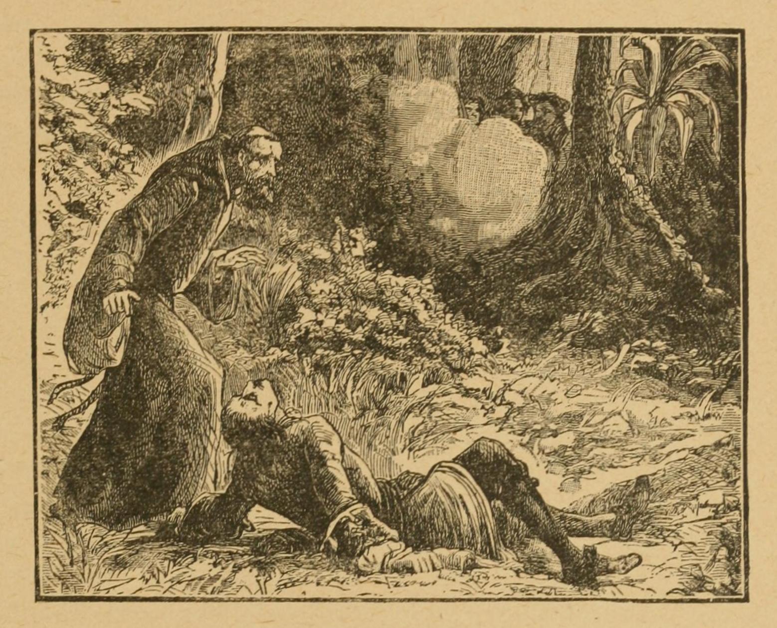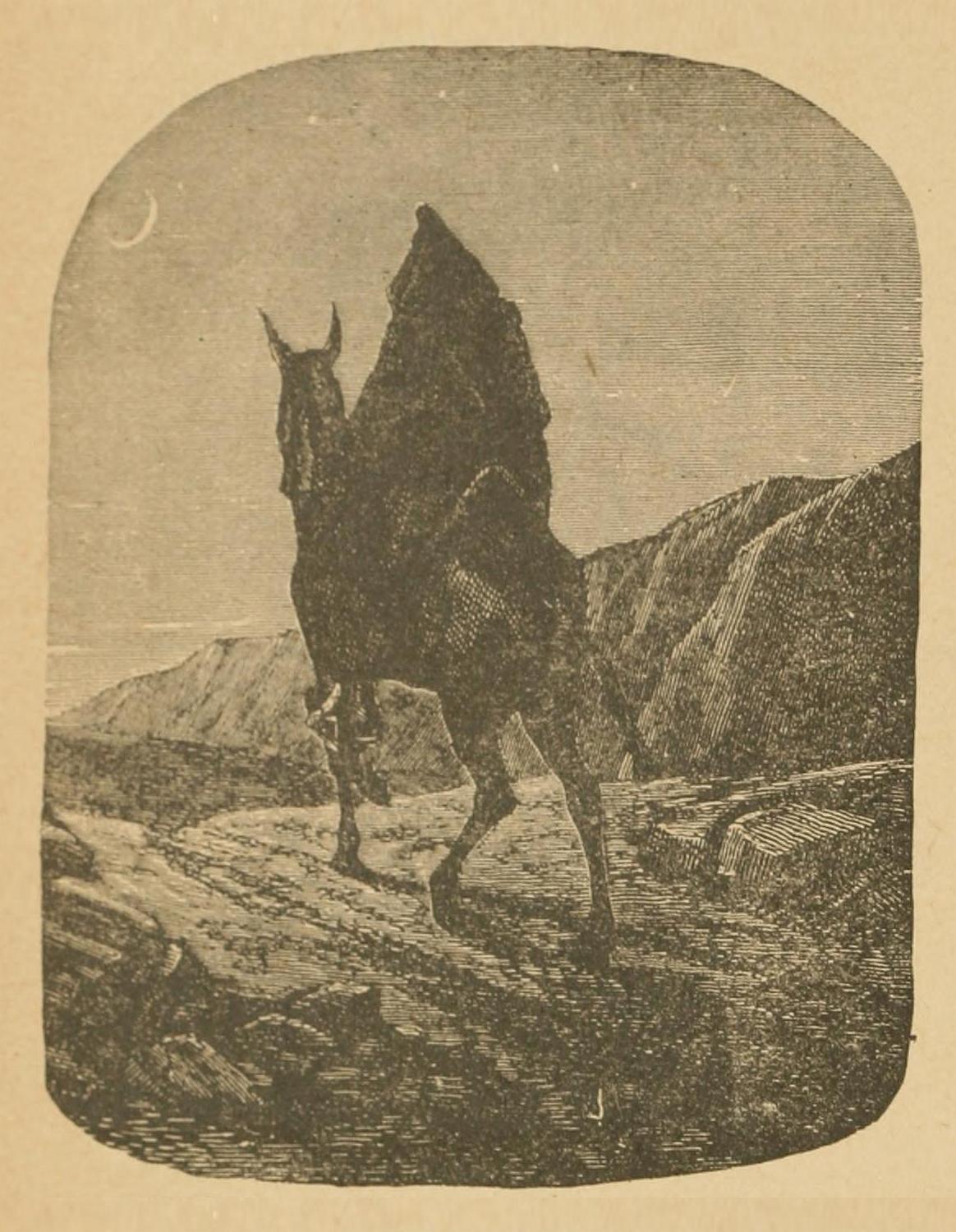 Thus far all went well, and the descent of the western slope was all but accomplished, when it became necessary to encamp for the night. Cozens had fallen asleep, and was dreaming of the lovely scenes he was about to visit, when he was suddenly awakened by a hand laid on his shoulder. He started up, revolver ready, but no one except “Jimmy,” the Irish servant, was near, who whispered, “She is calling me!” Thinking his servant had gone mad, or had woke up in terror from a nightmare, the master was about to order him off to bed again, when a low wail, like that of a child in trouble, fell upon his ear.