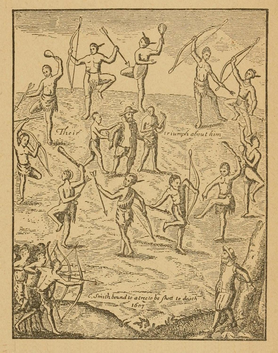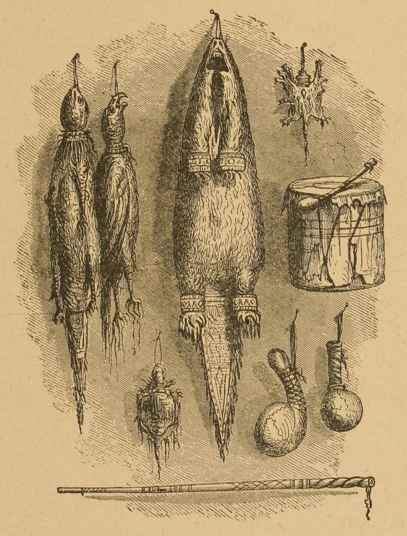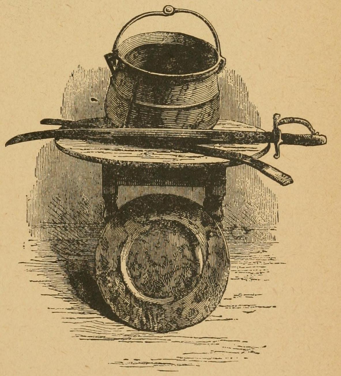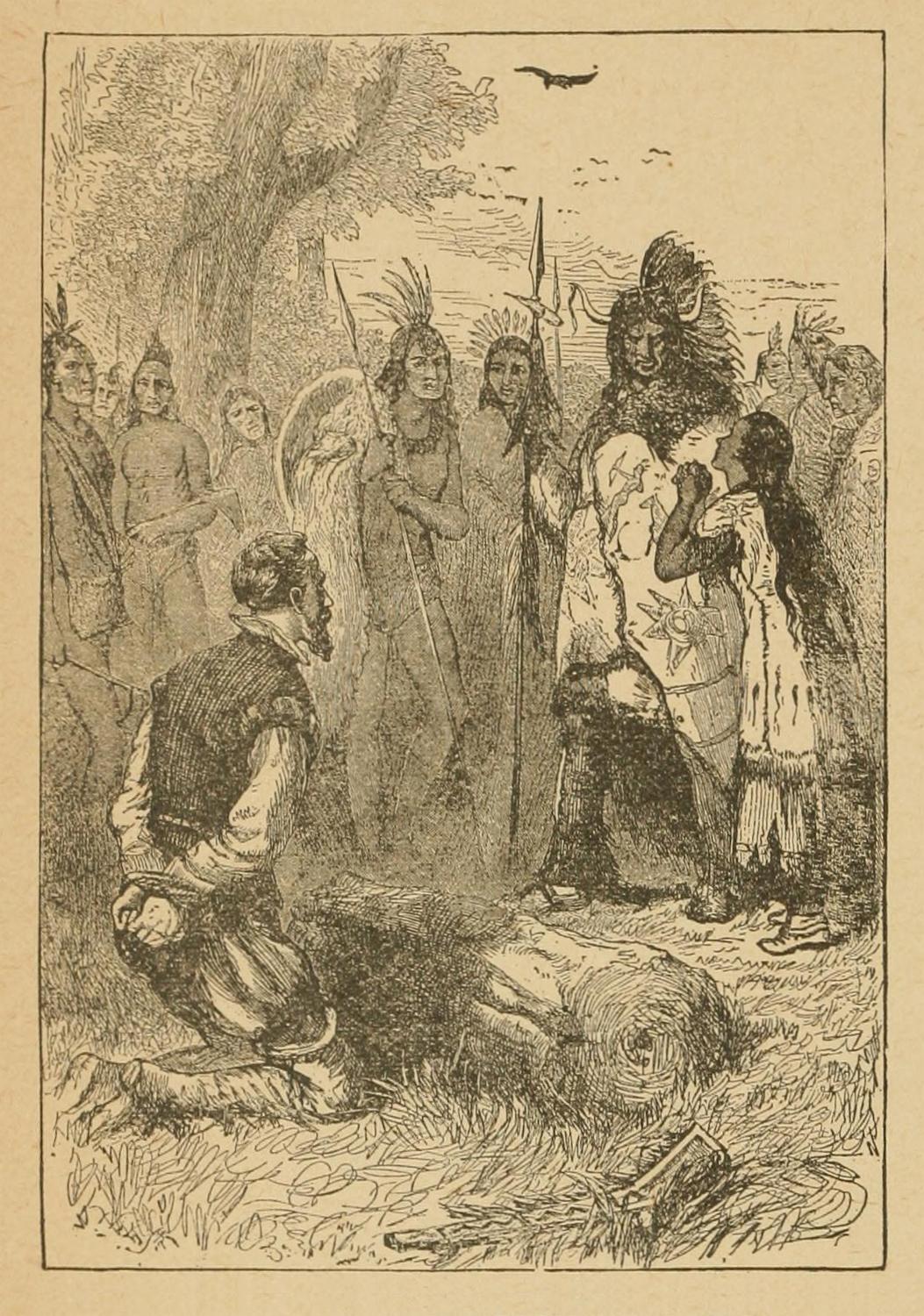 A huge fire, over which hung a steaming kettle, formed the center-piece of the open-air stage on which the revolting ceremony was performed. Round this kettle danced a number of half-naked braves and squaws, each holding aloft a spear crowned by a scalp, while every now and then one of the women snatched a piece of meat from the caldron, and offered it in derision to the ghastly human relics.
