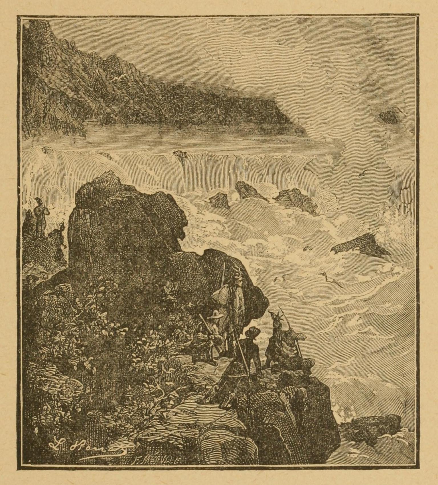 Descending into the gloom beneath the overhanging rock-masses, and feeling their way step by step in the darkness, with the mules so close behind them that a moment’s hesitation would have been certain death—for the animals would assuredly have pushed their masters over the abyss—the adventurers at last reached in safety the bed of the river, which had eaten out the pass of which they had availed themselves. Here a halt was made for the night, and on the ensuing day the descent of the ravine was completed, under difficulties even greater than those already conquered.