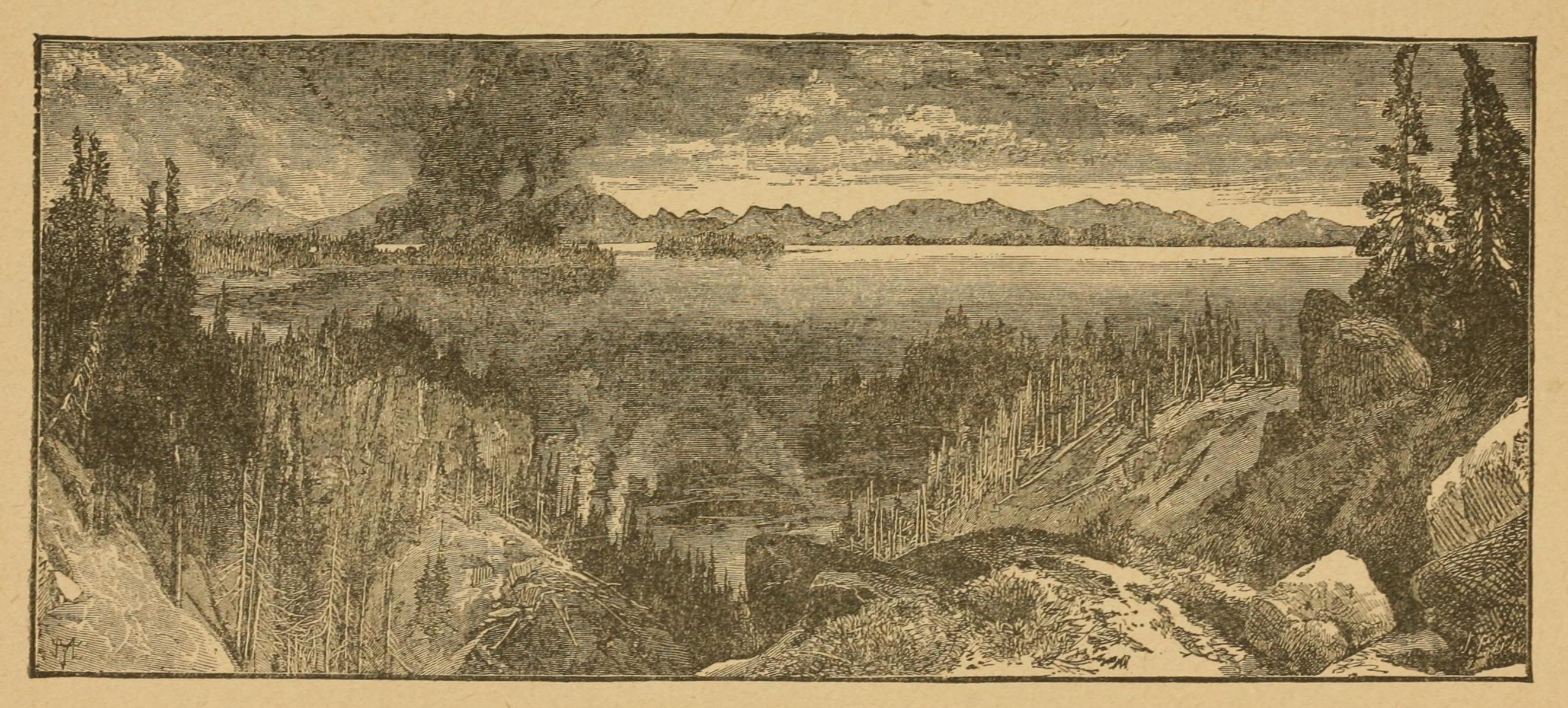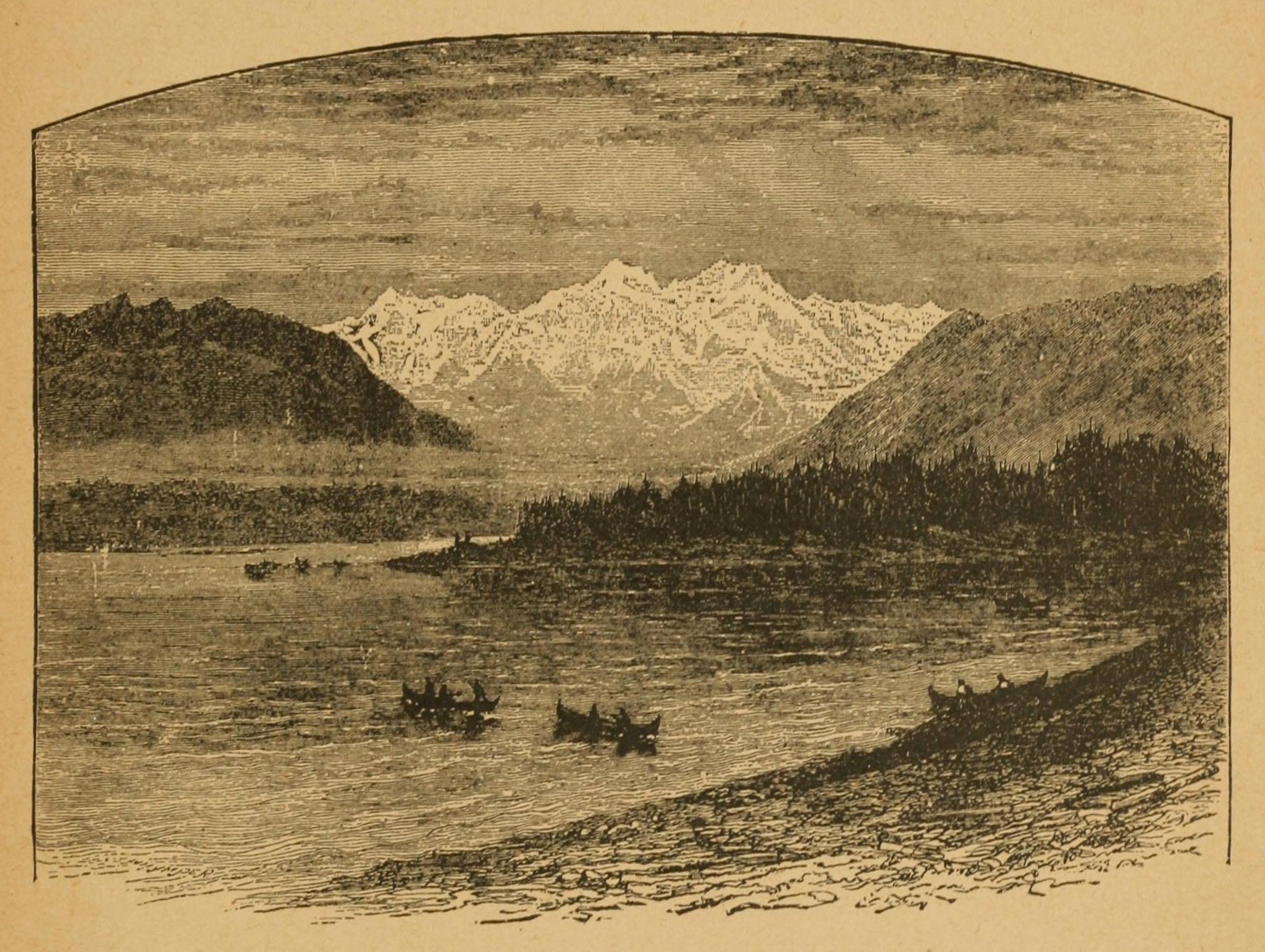 The last of the cattle brought for provisions for the party had been killed a day or two previously, and it was now a question of the utmost moment whether an attempt should be made to pierce the mountains on the east or go down through those on the west to the sea, when a number of Indians came out of a neighboring thicket who said their water was full of fish. The camp was at once pitched, and a little later the hungry explorers were enjoying a hearty meal of salmon trout. The natives, however, could give but little information about their country. They made a drawing of their river on the ground, representing it as issuing from another lake in the mountains three or four days distant, beyond which was a single mountain, and further away still were two rivers, on one of which white people like their guests traveled.