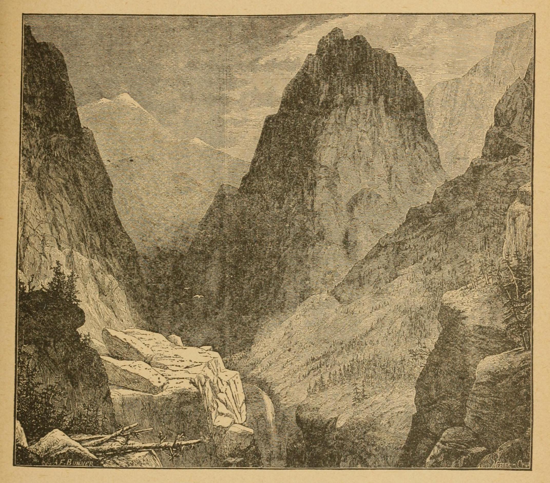 The first peak of the most easterly range of the mighty rocky barrier was scaled on the 20th January; but a violent snowstorm coming on compelled the travelers to turn southward, and encamp on the eastern side of the mountains. A little further on a large stream was discovered, which was followed to its outlet from the mountains, where the ascent of the ridge was again commenced. A wild and narrow pass, through which ran an Indian trail, with mountains on either side cased in snow and ice, led up to a lofty height, looking down from which, several natives were seen skimming and circling about on snow-shoes.