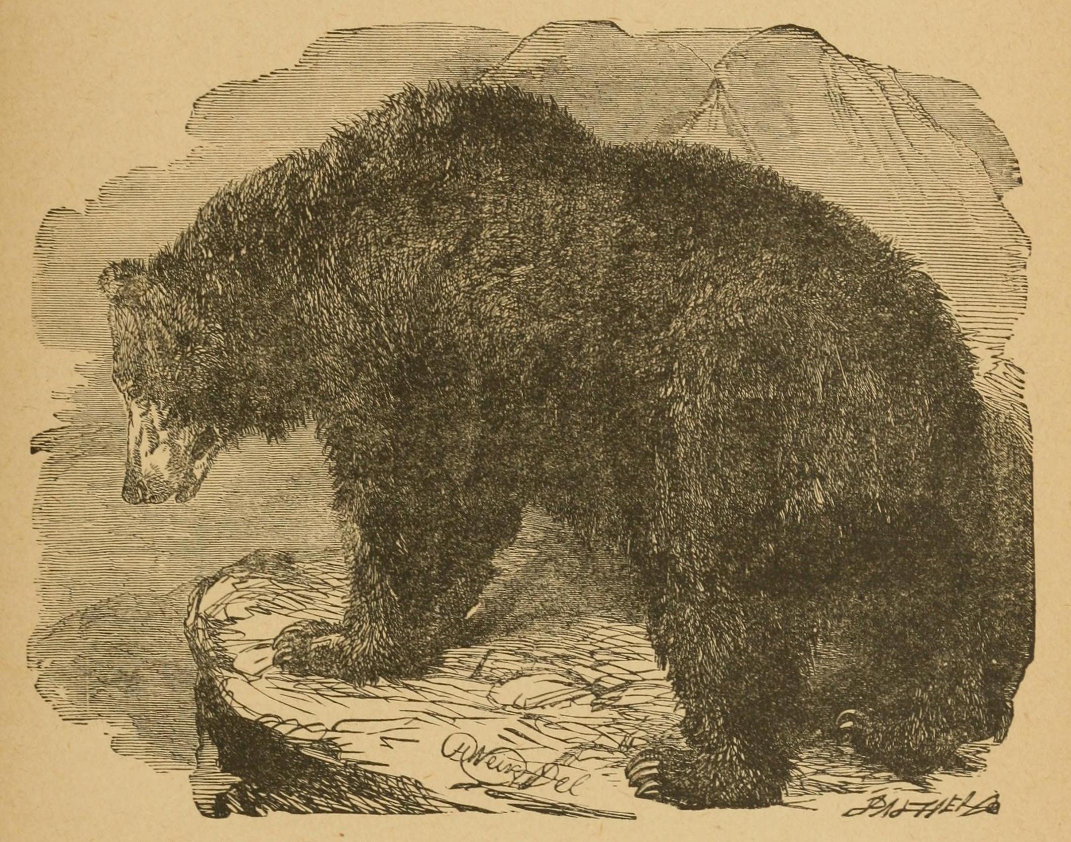The guide leading the way, all but Cozens, who was in no humor for the sport, ♦proceeded to climb up to the mouth of the hole, it being agreed that each should fire as he saw the bear emerge from his retreat. When all were in position, the guide commenced operations by dropping a large handful of pebbles in front of the mouth of the cave. The effect was almost immediate. But a minute or two elapsed before the hunted animal put his head out and calmly surveyed his tormentors. Rogers, one of the men farthest from the actual scene of action, now fired; the bullet struck the bear on the nose, and, furious with pain, he rushed at one of the party named Parker, who, flinging down his weapon, fled to a fir-tree hard by. As the doctor scrambled up the tree, the bear gazing ruefully after him, two well-directed shots brought the latter down dead, and, after a hearty laugh at Parker’s expense, the carcass was cut into strips, and packed among the stores for the journey.