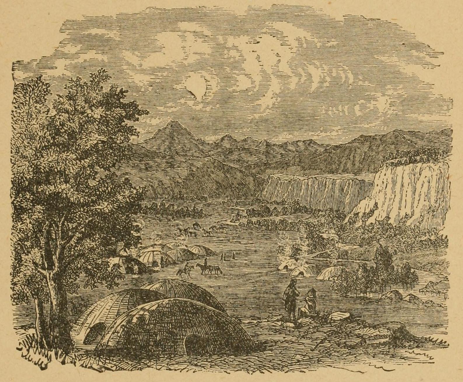 As the two gazed motionless upon this scene of peace and plenty in the wilderness, they were suddenly perceived by the Indians. A loud yell notified the fact, and in a moment the village was astir; children running together, dogs barking, warriors hastily seizing their weapons. But Cochise, the wandering war-chief, raised his hand and gave utterance to a peculiar cry. He was recognized at once, the arms were thrown aside, and, quickly descending the bluff, the two travelers were received by a set of men whom Cozens characterizes as the most degraded-looking creatures he had ever seen. The women especially, he says, “were ugly, fat and dirty,” and nowhere did he see any of the beautiful squaws described in the works of Cooper, the ♦romanticist of the Indians.