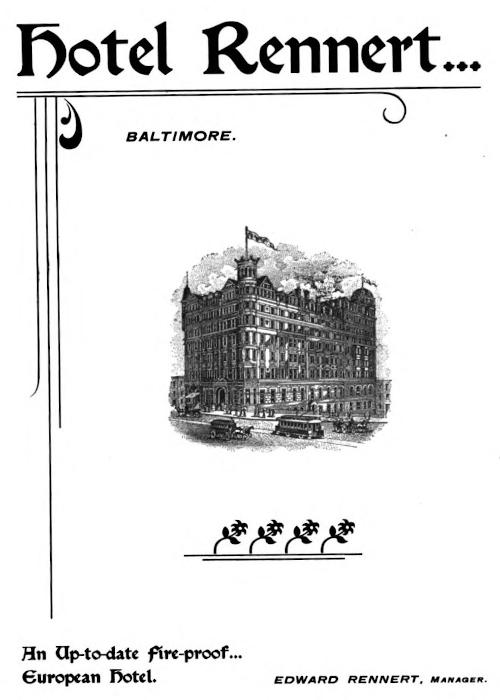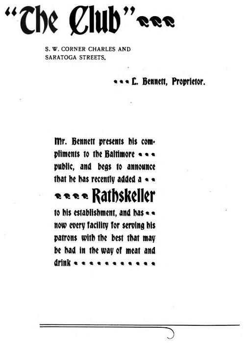 Mr. Bennett presents his compliments to the Baltimore public, and begs to announce that he has recently added a Rathskeller to his establishment, and has now every facility for serving his patrons with the best that may be had in the way of meat and drink.