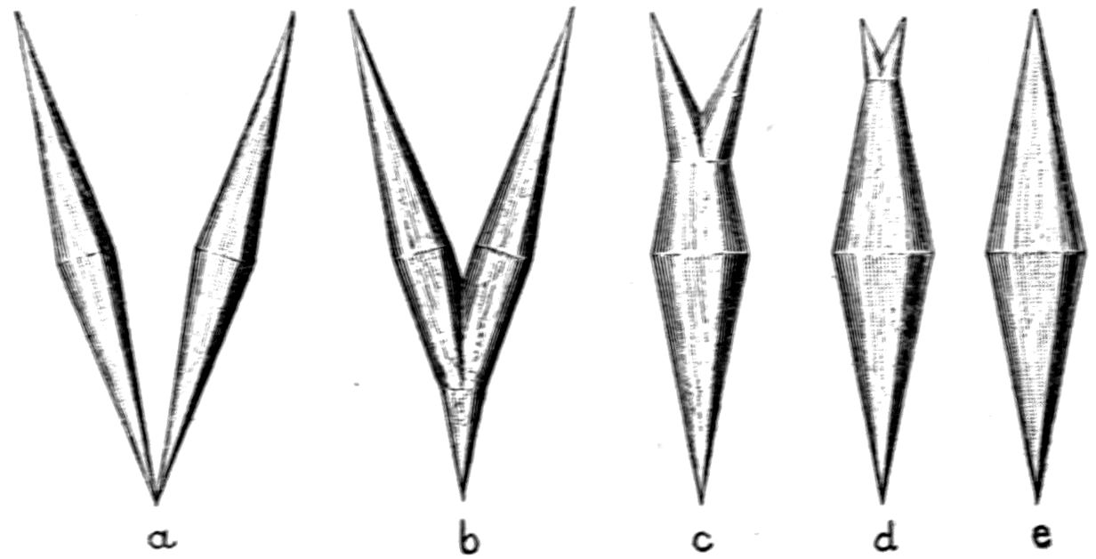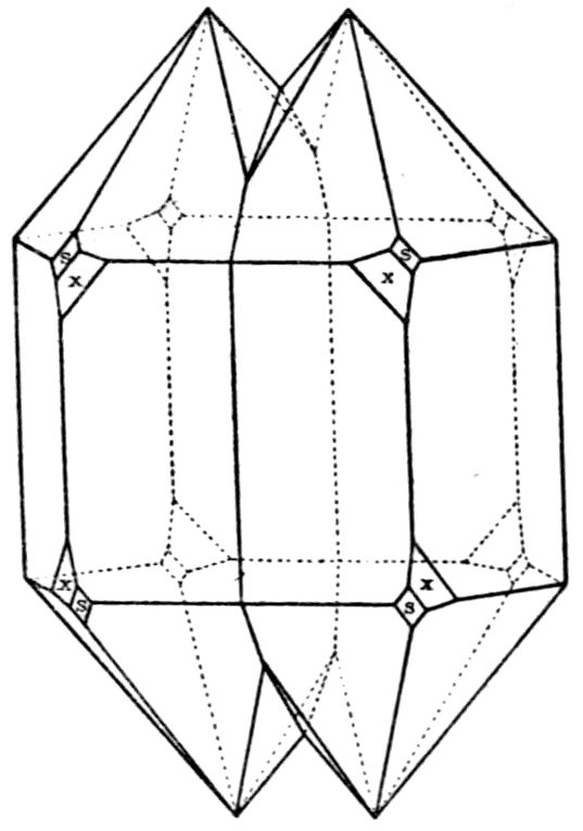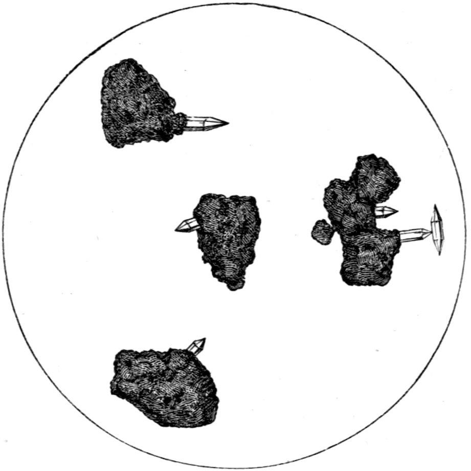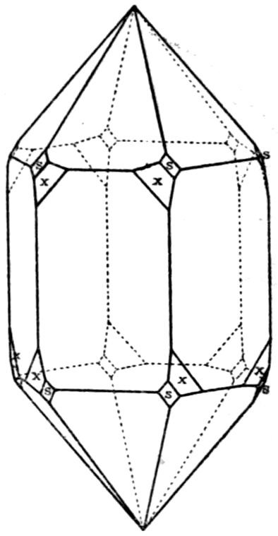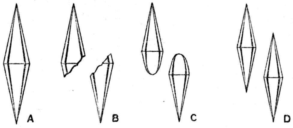 A crystal of quartz, rock-crystal, for instance—detached, during the course of the disintegration of the granitic rock of which it had originally formed an individual crystal, by the denuding influences at work in nature thousands of years ago, subsequently knocked about the world as a rounded sand grain, blown over deserts by the wind, its corners rounded off by rude contact with its fellows, and subjected to every variety of rough treatment—may eventually in our own day find itself in water containing in solution a small amount of the material of which quartz is composed, silicon dioxide SiO2. No sooner is this favourable environment for continuing its crystallisation presented to it, than, however old it may be, it begins to sprout and grow again. It becomes surrounded in all probability by a beautiful coating of transparent quartz, with exterior faces inclined at the exact angles of quartz, although no sign of exterior faces had hitherto persisted through all the stages of its varied adventures. Or it may grow chiefly at two or three especially favourable places, and in the course of a few weeks, under suitable conditions, at each place a perfect little quartz crystal will radiate out from the sand grain, composed of a miniature hexagonal prism terminated by the well-known pyramid, really consisting of a pair of 3trigonal (rhombohedral) pyramids more or less equally developed, and together producing an apparently hexagonal one. Four such grains of sand, from which quartz crystals are growing, are shown in Fig. 1, as they appear under a microscope magnifying about fifty diameters. One of them shows a perfectly developed doubly terminated crystal of quartz growing from the tip of a singly terminated one, attached to and growing directly out of the grain.