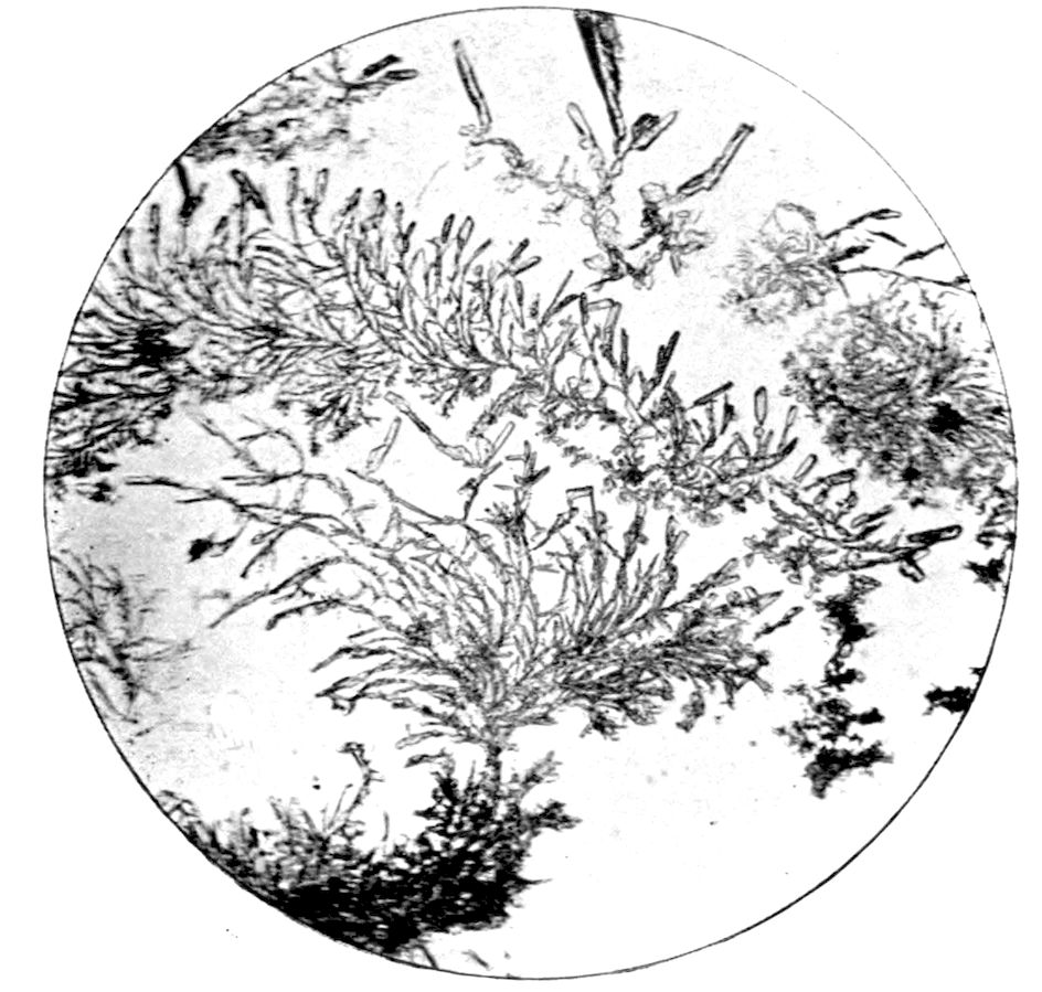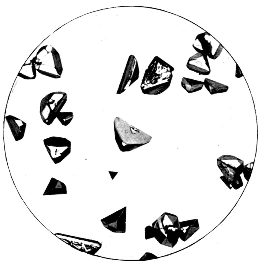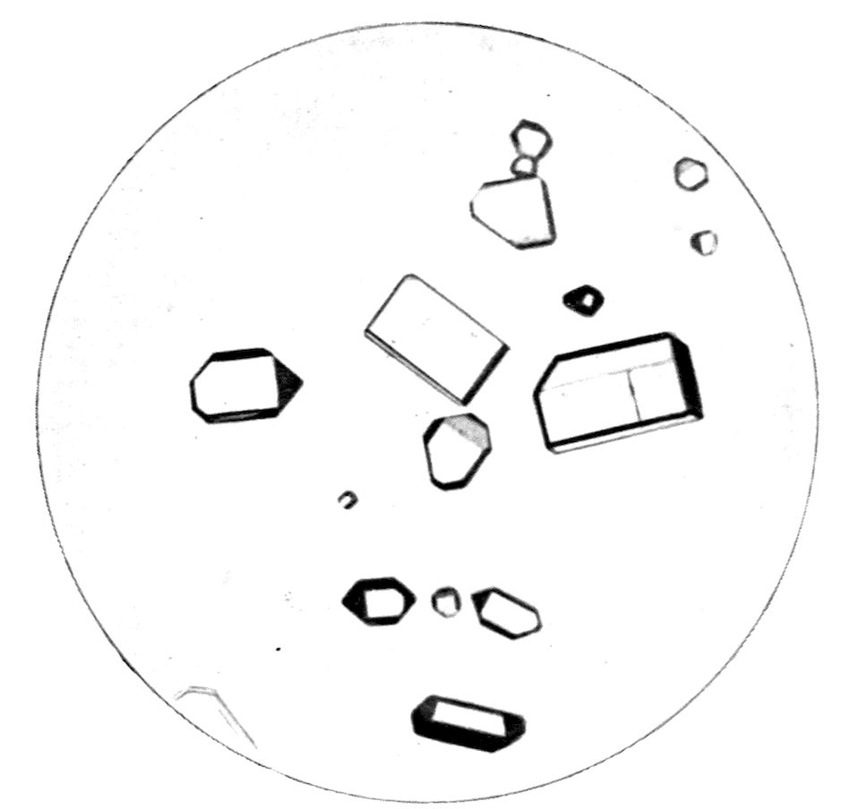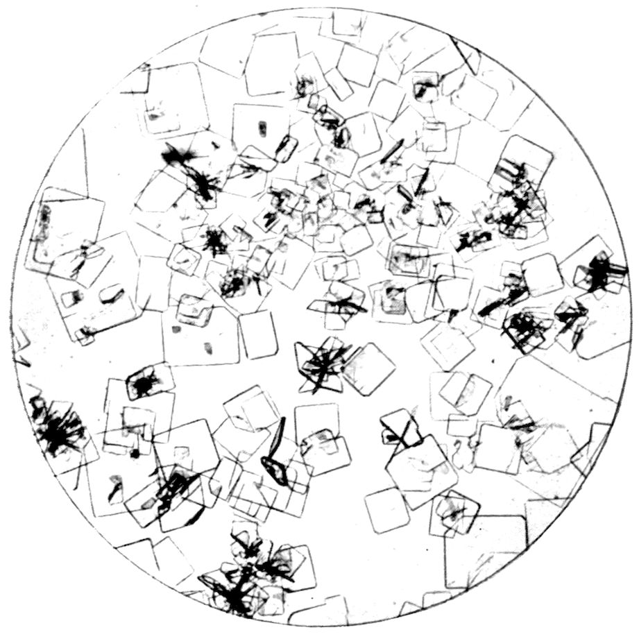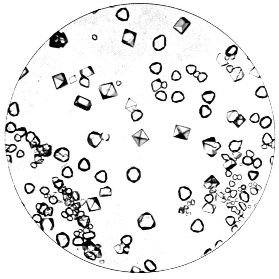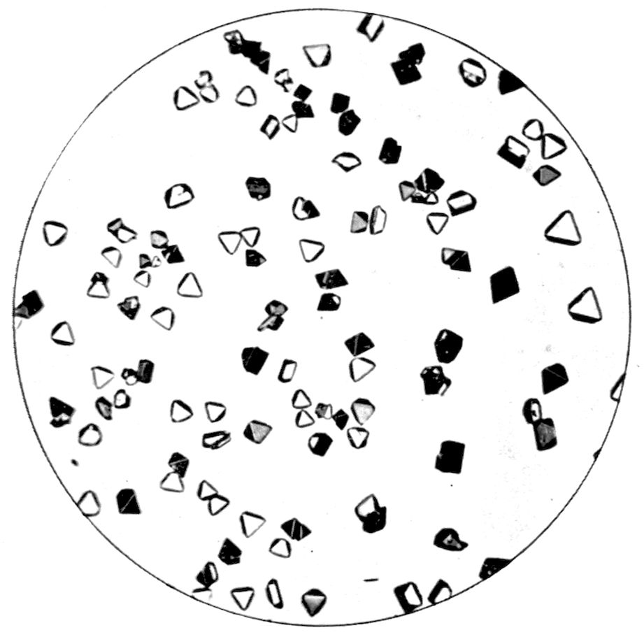 5Or the substance may be one which passes directly from the gaseous to the solid condition, on the cooling of the vapour from a temperature higher than the ordinary down to the latter, under atmospheric pressure. Oxide of arsenic, As2O3, is a substance exhibiting this property characteristically, and Fig. 3 (Plate I.) is a reproduction of a photograph of crystals of this substance thus produced. The white solid oxide was heated in a short test tube over a Bunsen flame, and the vapour produced was allowed to condense on a microscope glass slip, and the result examined under the microscope, using a 1½ inch objective. Fig. 3 represents a characteristic field of the transparent octahedral crystals.