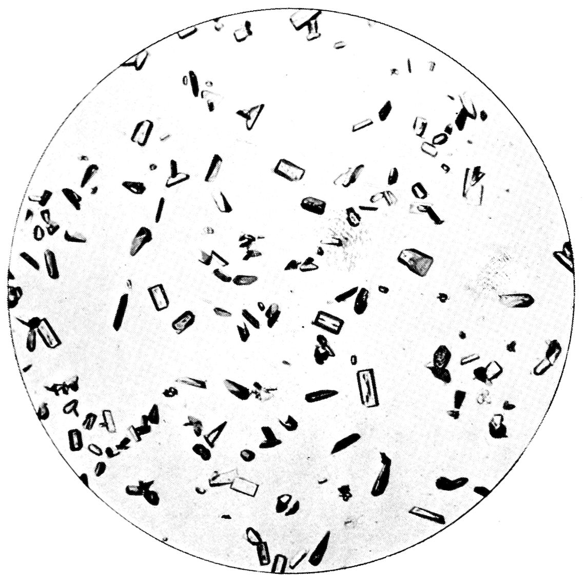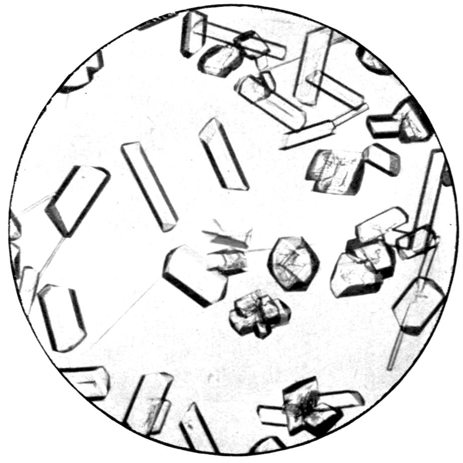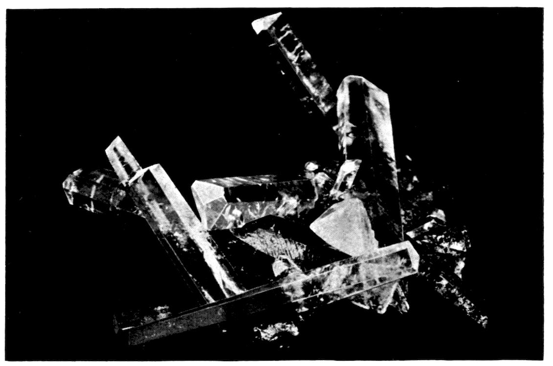 A further example may perhaps be given, that of a substance, hydrated sulphate of lime, CaSO4.2H2O, which occurs in nature as the beautiful transparent mineral gypsum or selenite—illustrated in Fig. 9, and which is found in monoclinic crystals often of very large size—and which may also be chemically prepared by adding a dilute solution of sulphuric acid to a very dilute solution of calcium chloride. The radiating groups of needles shown in Fig. 10 (Plate II.) slowly crystallise out when a drop of the mixed solution is placed on a microscope slip and examined under the microscope, using the one-inch objective. These needles, so absolutely different in appearance from a crystal of selenite, are yet similar monoclinic prisms, but in which the prismatic form is enormously elongated compared with the other (terminating) form.