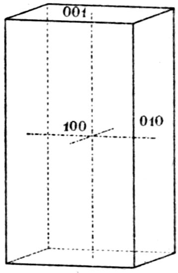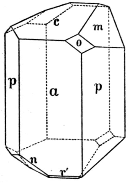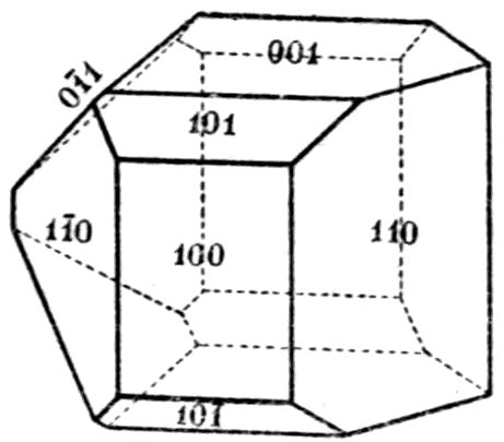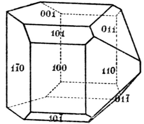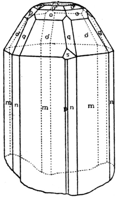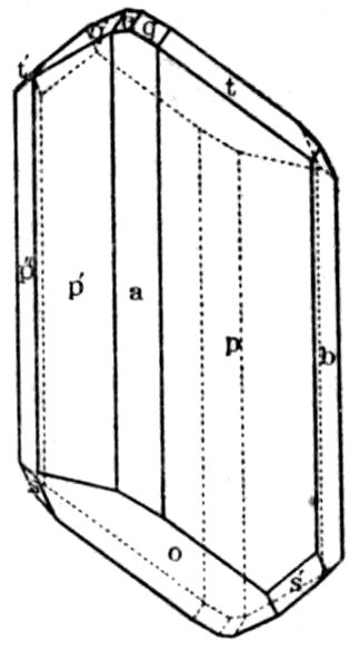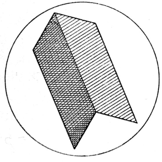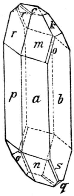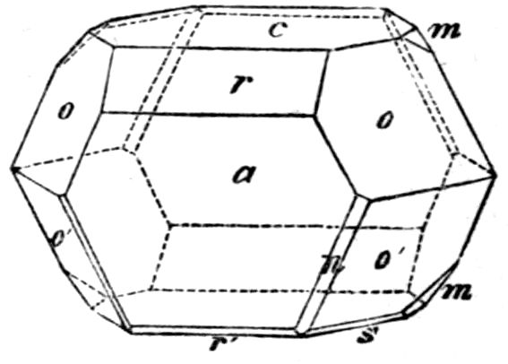 This illustration from the naturally occurring minerals might readily be supplemented by almost any common artificial chemical preparation, sulphate of potash for instance, K2SO4, the orthorhombic crystals of which take the form of elongated prisms, even needles, on the one hand, or of tabular plate-like crystals on the other hand, according as the salt crystallises by the cooling of a supersaturated solution, or by the slow evaporation of a solution which at first is not quite saturated. In both cases, and in all such cases, whether of minerals or chemical preparations, the same planes are present on the crystals of the same substance, although all may not be developed on the same individual except in a few cases of crystals particularly rich in faces; and these same planes are inclined at the same angles. But their relative 14development may be so very unlike on different crystals as to confer habits so very dissimilar that the fact of the identity of the substance is entirely concealed.