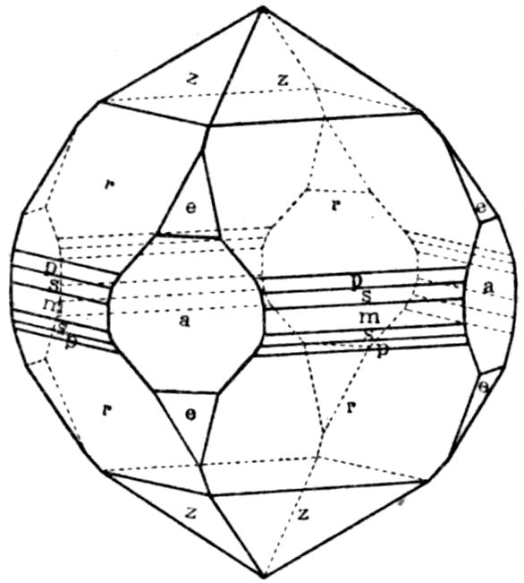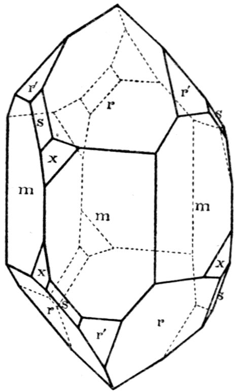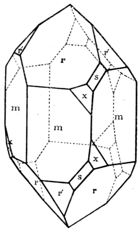 It is obviously then the “habit” which is different in the three types of calcite—Iceland spar, prismatic calc-spar, and dog-tooth spar—doubtless owing to the different local circumstances of growth of the mineral. Habit is simply the expression of the fact that a specific “form,” or possibly two particular forms, is or are much more prominently developed in one variety than in another. Thus the principal rhombohedron r = {100}, parallel to the faces of which calcite cleaves so readily, is the predominating form in Iceland spar, while the 13scalenohedron v = {20̄1} is the habit-conferring form in dog-tooth spar. Yet on the latter the rhombohedral faces are frequently developed, blunting the sharp terminations of the scalenohedra, especially in dog-tooth spar from Derbyshire or the Hartz mountains; and on the former minute faces of the scalenohedron are often found, provided the rhombohedron consists of the natural exterior faces of the crystal and not of cleavage faces. In the same manner the prismatic crystals from Egremont are characterised by two forms, the hexagonal prism m = {2̄1̄1} and the secondary rhombohedron e = {110}, but both of these forms, as we have seen on the actual crystal represented in Fig. 8, are also found developed on other crystals of mixed habit.