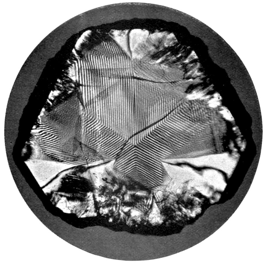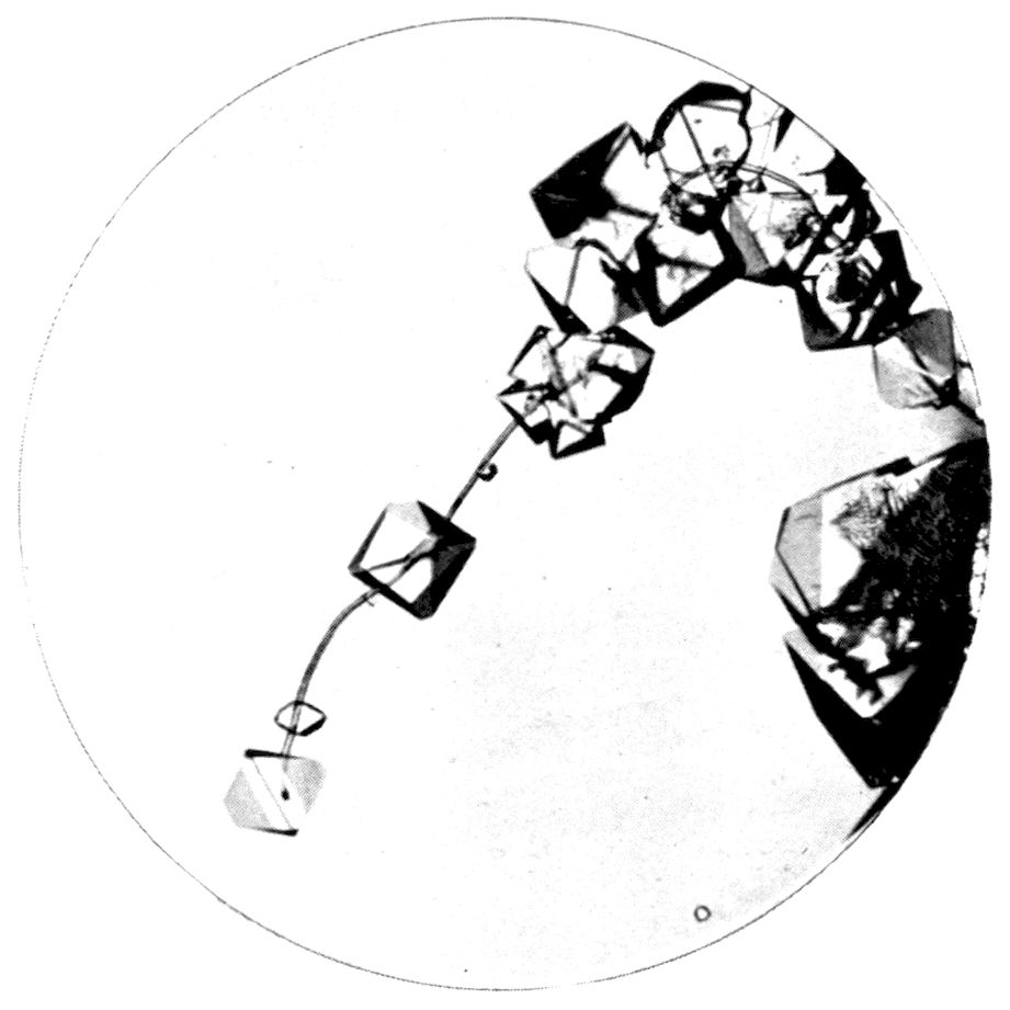 Or again, the crystal may have been deposited from the state of solution in a solvent, in which case it is a question of the passage of the substance from the liquid to the solid condition, complicated by the presence of the molecules of the solvent, from which the molecules of the crystallising solid have to effect their escape. Fig. 4 (Plate II.) represents crystals of potash alum, for instance, growing from a drop of saturated solution on a glass slip placed on the stage of the microscope, the drop being spread within a hard ring of gold size and under a cover-glass, in order to prevent rapid evaporation and avoid apparent distortion by the curvature of an uncovered drop. The crystals are of octahedral habit like those of oxide of arsenic, but many of them also exhibit the faces of the cube.