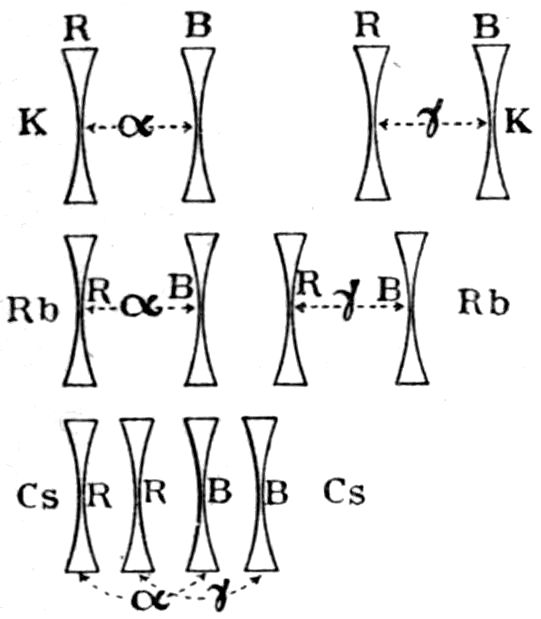Moreover, there is yet another view, that of Sollas,[30] that the packing of the molecules is a more open one altogether, a view to which he has been guided by consideration of the molecular volume. Sollas has offered some remarkable explanations of crystal structure, notably in the case of the dimorphous forms of silver iodide. The abnormal contraction which occurs on heating this interesting substance, and its sudden transformation at 146° from the ordinary hexagonal into a cubic modification as discovered by Lehmann, appear capable of very clear explanation on the basis of his theory. According to this theory of Sollas the volumes of the spheres of influence of the atoms of the different elements of the same family group, such as those of the group of alkali metals or those of the halogens, chlorine, bromine, and iodine, vary progressively in a manner which is dependent on the atomic volumes of the elements, which have a real comparative significance when the elements belong to the same family group.