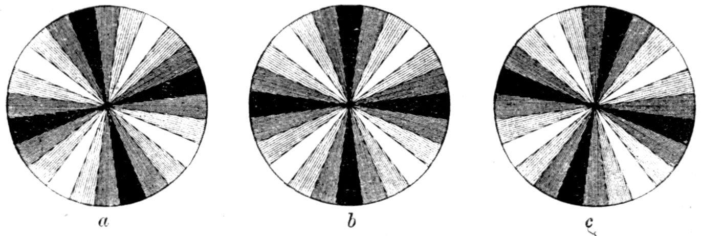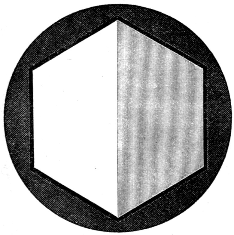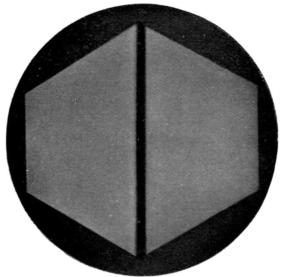 Fig. 90.—Screen Picture in Polarised Light, with Nicols crossed, of a thick Plate perpendicular to the Axis of a naturally twinned Crystal of Quartz, the left half being of right-handed Quartz and the right half of alternately left and right-handed Quartz, the Planes of Demarcation being oblique to the Plate.