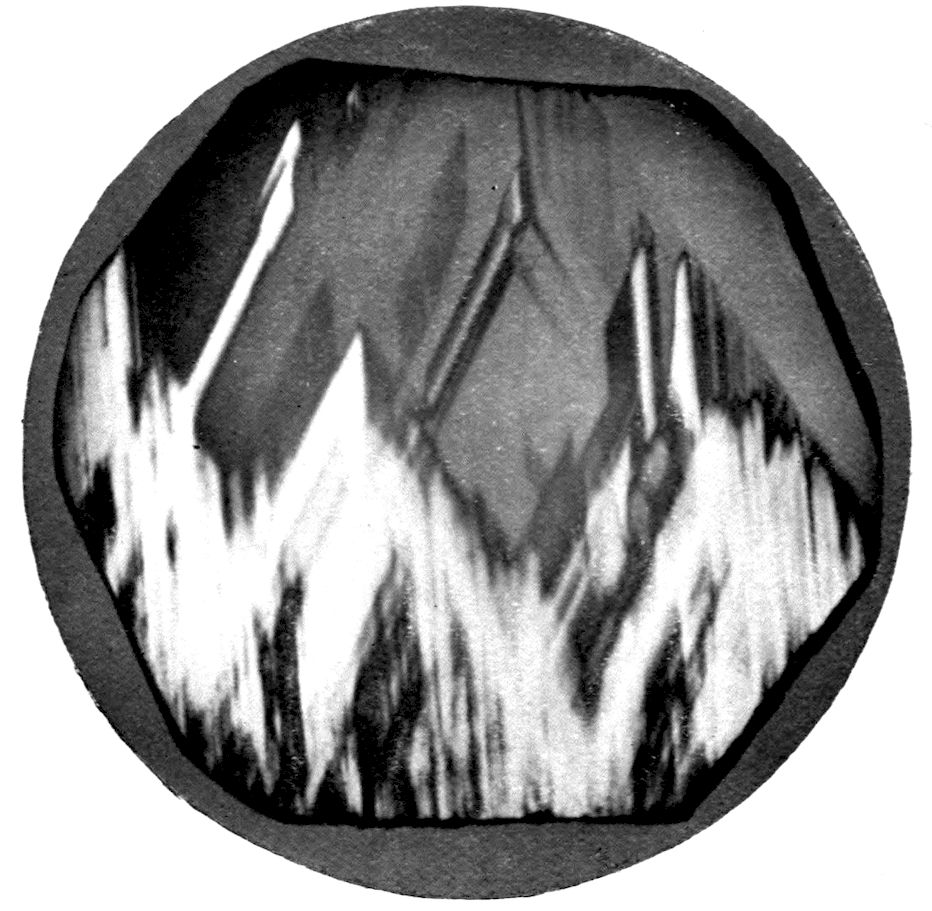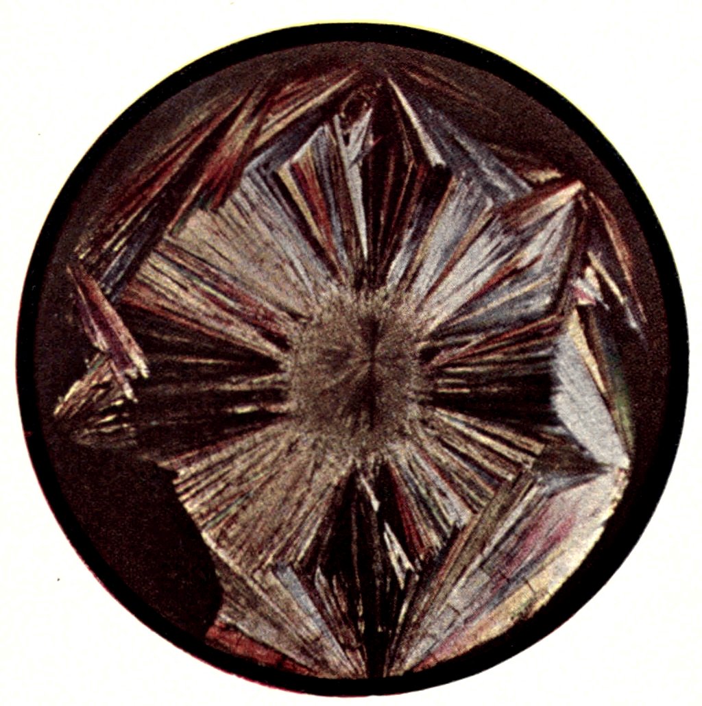 The solid crystal may have been produced during the simple act of congealment from the liquid state, on the cooling of the heated liquefied substance to the ordinary temperature. Sulphur, for instance, is well-known to crystallise in acicular crystals belonging to the monoclinic system under such conditions, a characteristic crop being shown in Fig. 2 (Plate I.); they were formed within an earthenware crucible in which the fusion had occurred, and became revealed on pouring out the remainder of the liquid sulphur when the crystallisation had proceeded through about one-half of the original amount of the “melt.”