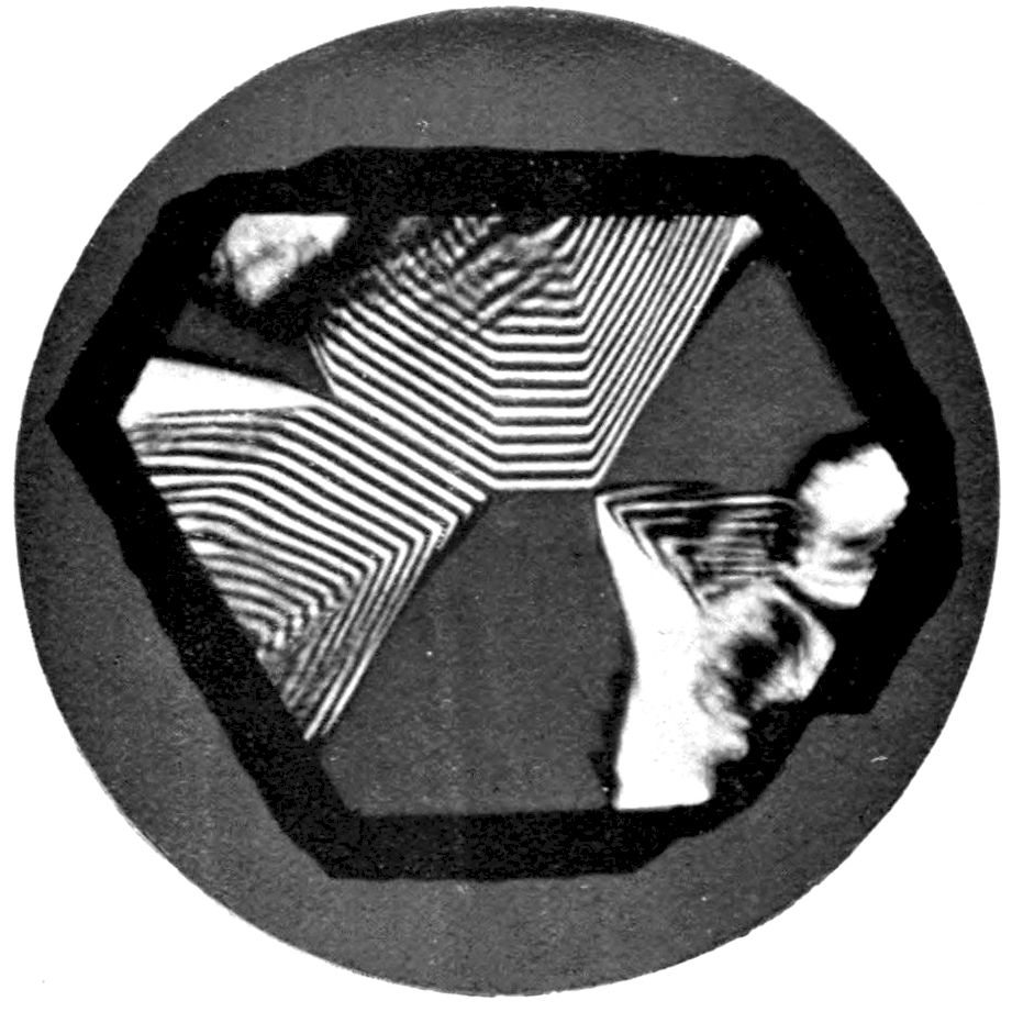 It is a remarkable fact that no definition of life has yet been advanced which will not apply to a crystal with as much veracity as to those obviously animate objects of the animal and vegetable world which we are accustomed to regard in the ordinary sense as “living.” A crystal grows when surrounded by a suitable environment, capable of supporting it with its natural food, namely, its own chemical substance in the liquid or vaporous state or dissolved in a solvent. Moreover, when a crystal is broken, and then surrounded with this proper environment, it grows much more rapidly at the broken part than elsewhere, repairing the damage done in a very short space of time and soon presenting the appearance of a perfect crystal once more. In this respect it is quite comparable with animal tissue, the wonderful recuperative power of which after injury, exhibited by special growth at the injured spot, is often a source of such marvel to us. Indeed, a crystal may be broken in half, and yet each half in a relatively very brief interval 2will grow into a crystal as large as the original one again. The longevity and virility of the spores and seeds of the vegetable kingdom have been the themes of frequent amazement, although many of the stories told of them have been unable to stand the test of strict investigation. The virility of a crystal, however, is unchanged and permanent.