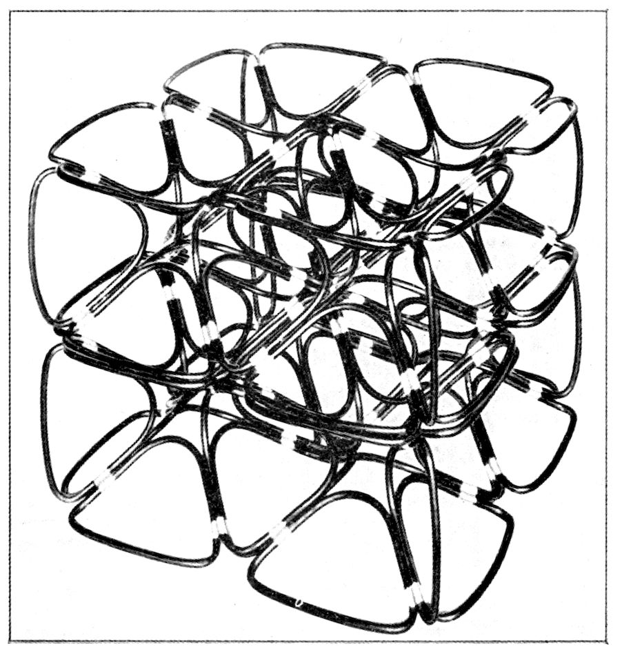 Starting from the facts which have now been laid down in this book as having been firmly established by the most careful measurement and experimental investigation—notably the constancy of the interfacial angles of the crystals of the same substance, the fixed positions of the atoms or their spheres of influence in the molecule and in the crystal, and the arrangement of the molecules in space-lattices and the atoms in point-systems—Pope and Barlow assume that valency, the expression of the relative combining power of the chemical elements, is a question of the size of the sphere of influence of the atom of an element, and that the relative sizes of such spheres of influence determine the modes in which they can be packed, that is, the nature of the homogeneous crystal structure which they can build up. The theory consequently renders the chemical phenomenon of 287valency and the physical phenomenon of crystalline form mutually interdependent.