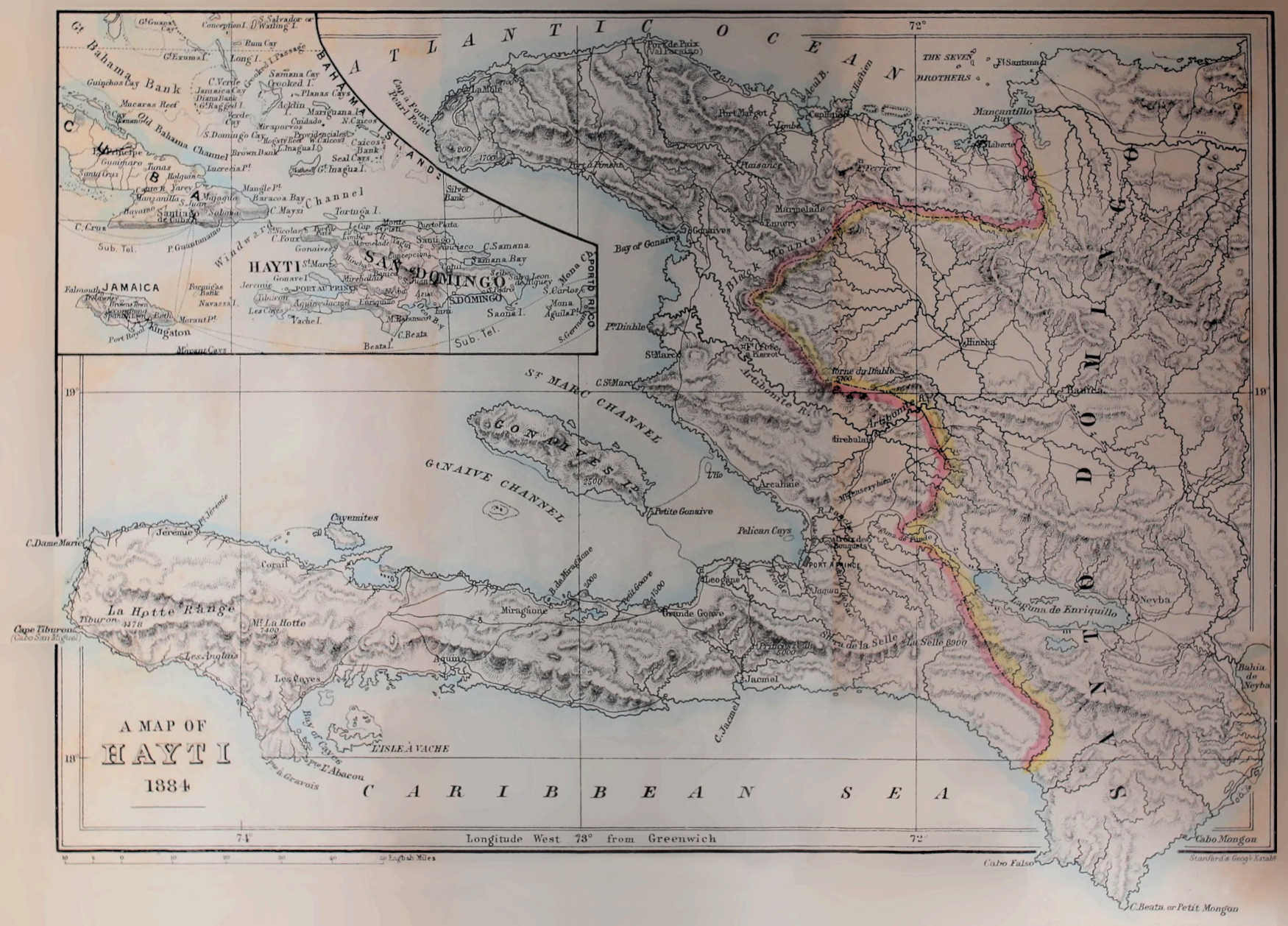 The island of Santo Domingo is situated in the West Indies between 18° and 20° north latitude and 68° 20’ and 74° 30’ west longitude. Its greatest length is four hundred miles, its greatest breadth one hundred and thirty-five miles, and is calculated to be about the size of Ireland. Hayti occupies about a third of the island—the western portion—and, pushing two great promontories into the sea, it has a very large extent of coast-line. It is bounded on the north by the Atlantic Ocean, on the east by the republic of Santo Domingo, on the south by the Caribbean Sea, and on the west by the passage which separates it from Cuba and Jamaica.
