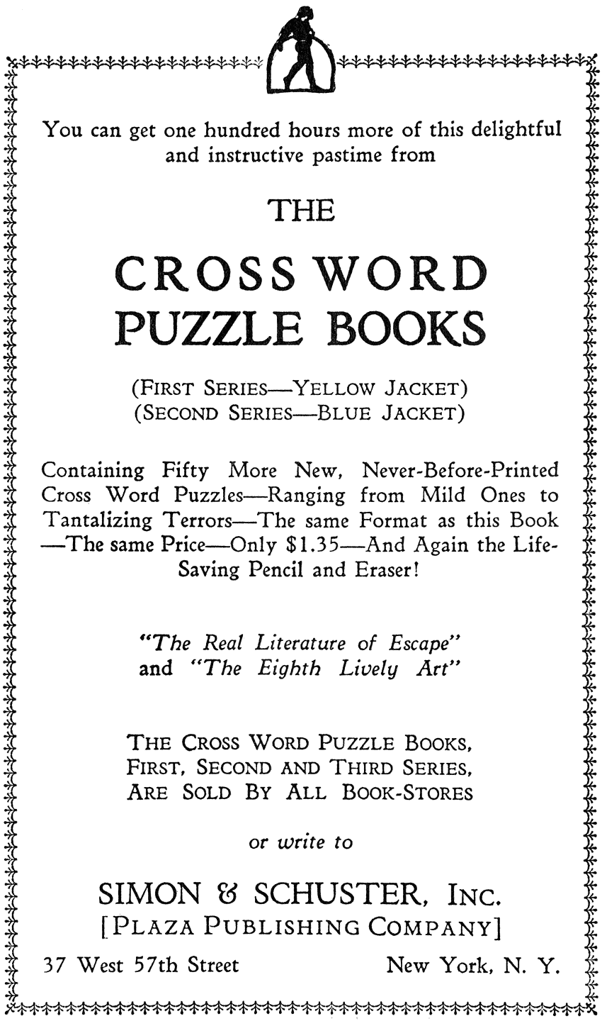 The publishers and editors of the Cross Word Puzzle Books wish to record the debt of all Cross Word fans to The New York World for its pioneer work in the field. Cross Word Puzzles have been run in the Sunday World for over twenty years and their present nation-wide vogue had its origin in and received its greatest impetus from the Puzzle Page of the Sunday World Magazine. The fifty cross word puzzles in this book are all entirely new and have never been printed before in any publication.