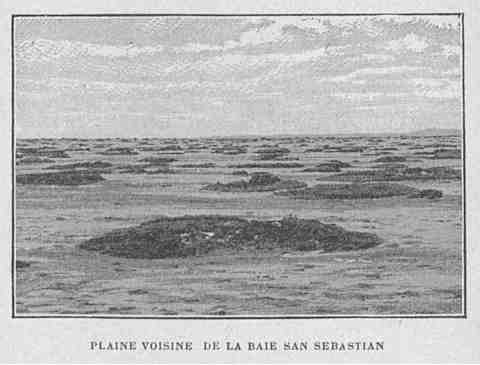 Le 9 janvier 1896, la petite troupe rejoignait la baie de San Sebastian et immédiatement s'acheminait droit au Sud, à travers la plaine délimitée par cette nappe d'eau et la Bahia Inutil. C'est la seule région basse, un peu étendue, de la Terre de Feu. Couverte dans sa plus grande partie d'une herbe drue, elle pourrait, elle aussi, nourrir des milliers de moutons. Dans l'Est, elle est d'une désolante aridité, formée d'une nappe[Pg 20] d'argile grise, absolument nue; ça et là seulement apparaissent de petits monticules couverts de plantes salicoles et de coquilles, notamment de Voluta magellanica, la plus grande coquille des mers australes. Au milieu de cette immensité d'une uniformité désespérante, la seule note gaie est donnée par des lagunes; à moitié desséchées pendant l'été, elles s'emplissent au printemps, et forment une immense nappe à l'aspect de bras de mer.