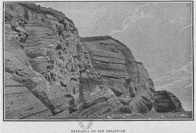 De l'autre côté de la dépression qui s'étend de la baie de San Sebastian à la Bahia Inutil, le terrain forme un massif accidenté dont l'altitude ne dépasse pas toutefois trois cents mètres. Afin d'éviter ces collines, la caravane suivit la plage au pied de la falaise. Une coupe géologique aussi nette que celles qui sont figurées dans un manuel, le barranca de San Sebastian! Il montre à nu toutes ses assises, laissant voir, en maints endroits, des gisements de fossiles. Ici, comme dans l'extrême Nord, il s'est produit, à une époque géologique relativement récente, une variation de climat très importante. Pendant les temps tertiaires, cette région, aujourd'hui absolument nue, était couverte de forêts de hêtres; à cette période chaude a succédé une phase froide pendant laquelle les glaciers des Andes se sont étendus jusqu'à l'Océan Atlantique.