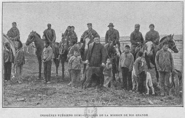 Après une nuit de bivouac au cap San Sebastian, la caravane poursuivit sa route au Sud. La traversée du rio Carmen Sylva, large, à son embouchure, d'environ trente mètres, un des plus importants cours d'eau de la Terre de Feu, fut le seul fait digne de mention avant d'arriver à la mission du rio Grande. Au milieu du désert, les Salésiens[Pg 26] ont fondé ici un établissement où ils recueillent les jeunes Indiens des deux sexes. Les filles sont soignées par des sœurs dans un bâtiment spécial; durant tout leur séjour à la mission les explorateurs suédois ne purent apercevoir une seule de ces enfants. Les Salésiens ont commencé leur apostolat en 1888, par la fondation d'une école à Port-Harris, dans l'île Dawson (détroit de Magellan), qui appartient au Chili. En 1894, ils étendirent leur action sur le territoire argentin et établirent la mission de Rio-Grande. Les enfants apprennent l'espagnol et reçoivent l'instruction primaire; aux filles on enseigne des travaux[Pg 29] manuels, aux adultes différents métiers, tels que ceux de briquetier, de scieur ou de menuisier.