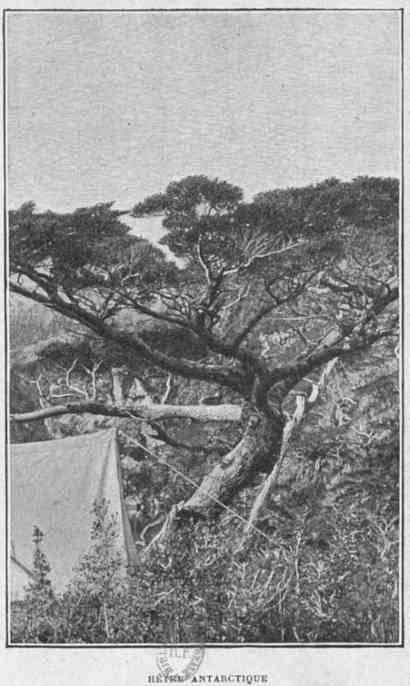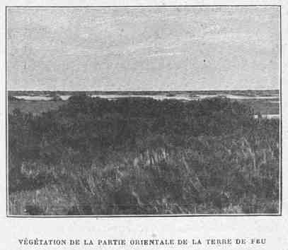«....... Sur ces dernières terres australes s'épanouit une végétation absolument luxuriante, d'une fraîcheur merveilleuse. Quel contraste avec la monotonie de la région située plus au Nord! De tous côtés d'immenses pelouses veloutées, sillonnées de ruisselets, parsemées de futaies de hêtres antarctiques. Cette essence, le Fagus pumilio, qui ne dépasse guère la taille de cinq à huit mètres, pousse des branches de ses racines mêmes et prend ainsi l'aspect d'une demi-sphère de verdure. Autour de ce parc anglais, des collines, également couvertes de futaies de hêtres, forment un encadrement, et dans le lointain bleuissent deux hautes chaînes de montagnes, la première boisée, l'autre, beaucoup plus haute, mouchetée de taches de neige.