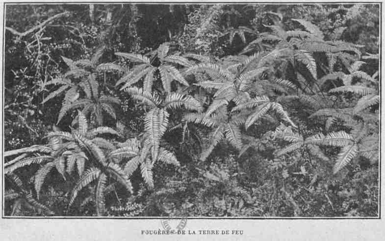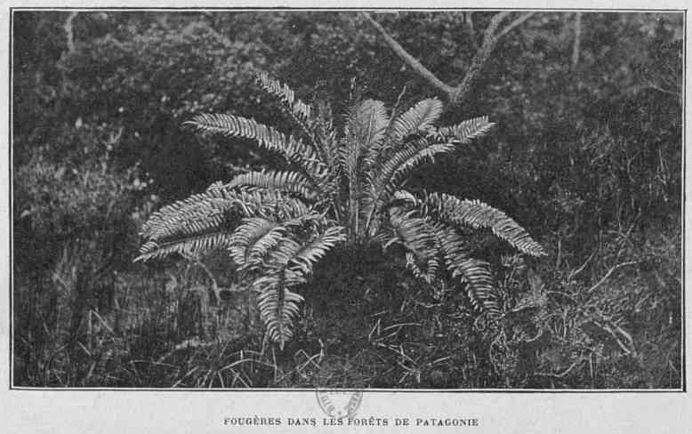 Ces indigènes passent presque toute leur vie à la mer, et tirent pour ainsi dire exclusivement leur alimentation des produits de la pêche. En différents endroits, sur les rives des canaux, ils ont des huttes couvertes de gazon et de peaux de phoques, et, suivant les nécessités de leur industrie, s'installent tantôt dans l'une, tantôt dans l'autre. Ils sont, du reste, contraints à la vie maritime par la nature même du pays. A quelques mètres de la rive commence une impénétrable forêt vierge, absolument fermée à l'homme. Cette forêt est un des principaux éléments de la beauté des paysages patagons. Avec juste raison tous les voyageurs se sont à l'envi extasiés sur l'extraordinaire contraste que présente cette verdure folle à côté des glaciers et des neiges éternelles. Les essences les plus communes sont le Fagus betuloïdes, un hêtre de petite taille dont le sommet s'étale en une superbe couronne, une espèce de[Pg 62] cyprès, et un magnolia, Drimys Winteri, dont la présence à une latitude aussi froide semble absolument extraordinaire. Et, entre les troncs pousse un fouillis inextricable de broussailles et de sous-bois: ce sont différentes espèces de Berberis, puis le Pernettya mucronata aux feuilles armées d'épines, chargé de baies comestibles, un Fuchsia de grande taille, constellé au printemps de magnifiques fleurs rouges, le Philesia baxifolia resplendissant de cloches de pourpre, enfin une fougère (Lomarya Boryana), dont la tige basse mesure parfois une épaisseur de 0 m. 30 et dont les feuilles peuvent atteindre une longueur de 0 m. 70.