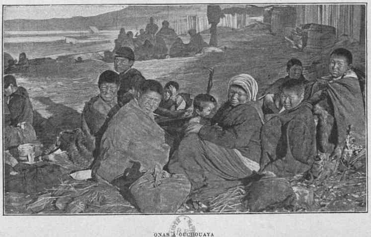 Les indigènes disséminés sur l'archipel qui précède à l'Ouest le détroit de Magellan sont toujours à l'affût du passage des grands paquebots. Dès qu'ils aperçoivent un transatlantique, immédiatement hommes, femmes et enfants se précipitent dans leurs canots et font force de rames pour couper la route au vapeur. Afin de donner pendant quelques instants à leurs passagers le spectacle de ces primitifs, les capitaines ont l'habitude de stopper. Aussitôt toute la bande grimpe à bord, et, pour prix de sa venue, reçoit du tabac, des allumettes et des défroques de toute espèce. Le petit vapeur sur lequel Nordenskjöld avait pris passage n'avait guère l'allure rapide des longs courriers. Aussi bien, à chaque détour du fjord des escadrilles de canots guettaient son passage.