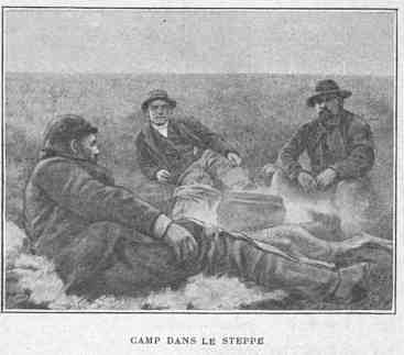 Mais bientôt le ciel noircit; subitement, quelques éclairs déchirent les nuages et un orage terrible se déchaîne, accompagné d'une trombe de grêle. Cinglés, les chevaux prennent peur et refusent d'avancer: ils ne sont habitués ni à ces éclairs aveuglants, ni aux éclats fulgurants de la foudre. Dans cette région, les orages sont extrêmement[Pg 22] rares et ne se produisent qu'à des intervalles de plusieurs années. La tourmente fut heureusement courte, le soleil reparut et, grâce à la brise constante qui souffle sur la plaine, vêtements et bagages furent bientôt secs.