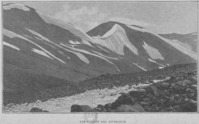«Nous dégringolons au fond du ravin, puis remontons sur l'arête. Là, nouvelle déception; une[Pg 49] troisième crête encore plus haute s'élève devant nous. Nous la gravissons, et par derrière, nous découvrons une vallée très profonde au milieu de laquelle serpente une grande rivière, le rio Bedbeber, affluent du lac Fagnano.