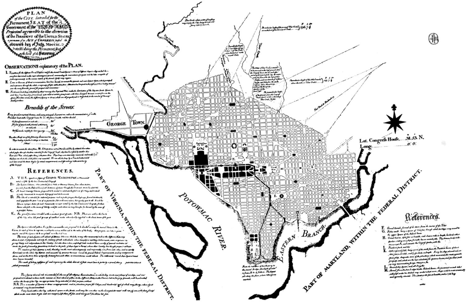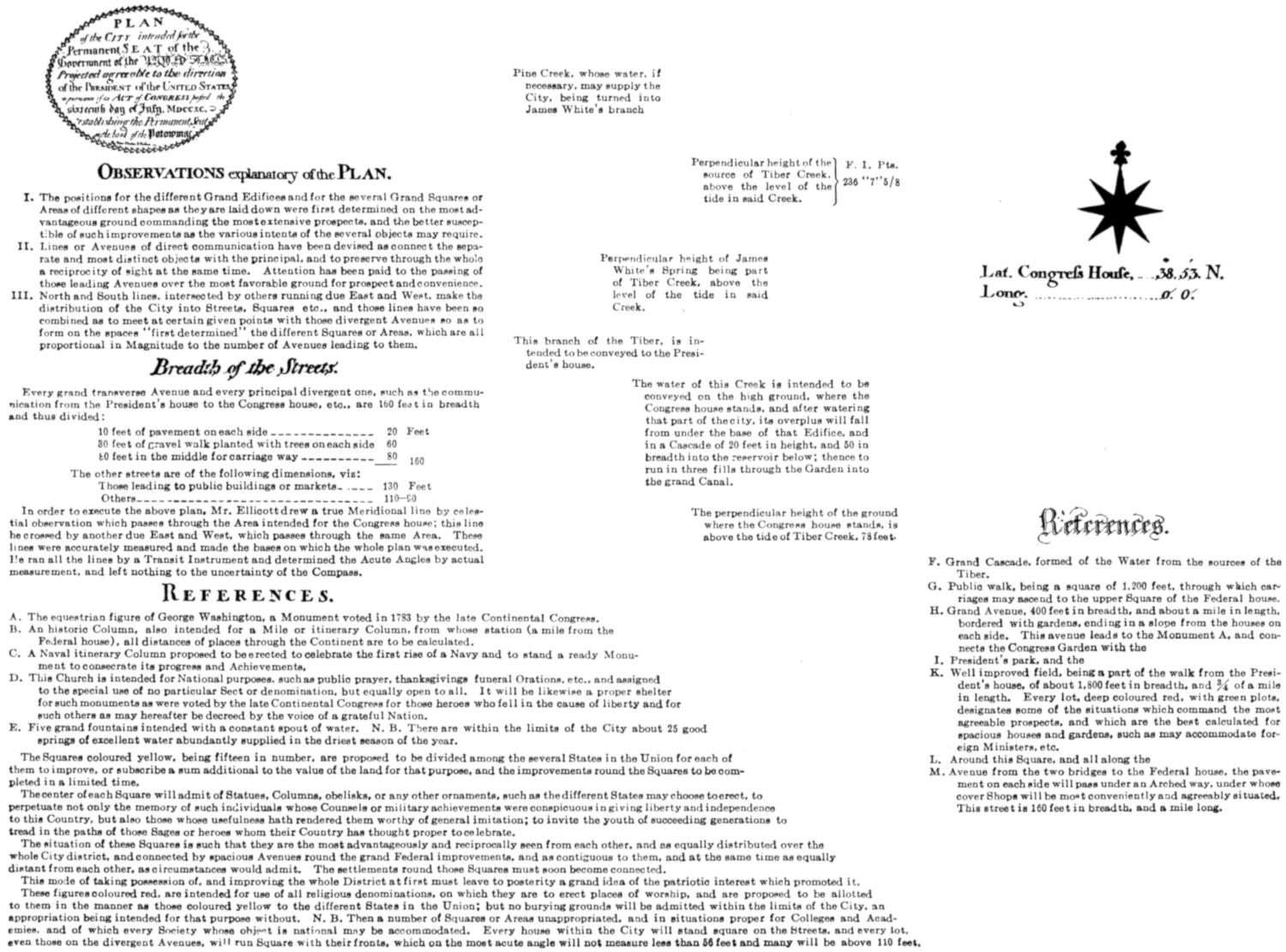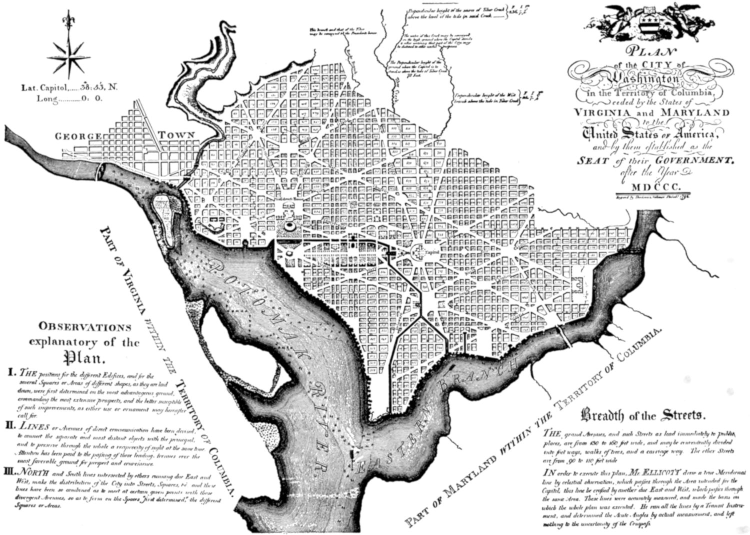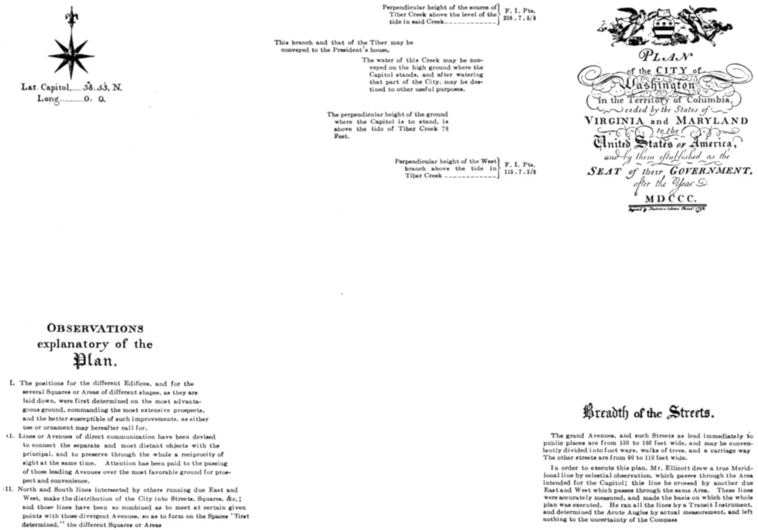 In order to execute this plan, Mr. Ellicott drew a true Meridional line by celestial observation, which passes through the Area intended for the Capitol; this line he crossed by another due East and West which passes through the same Area. These lines were accurately measured, and made the basis on which the whole plan was executed. He ran all the lines by a Transit Instrument, and determined the Acute Angles by actual measurement, and left nothing to the uncertainty of the Compass.