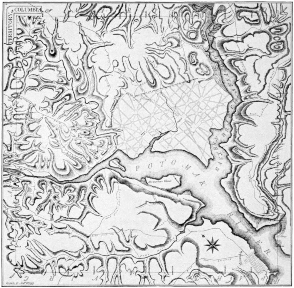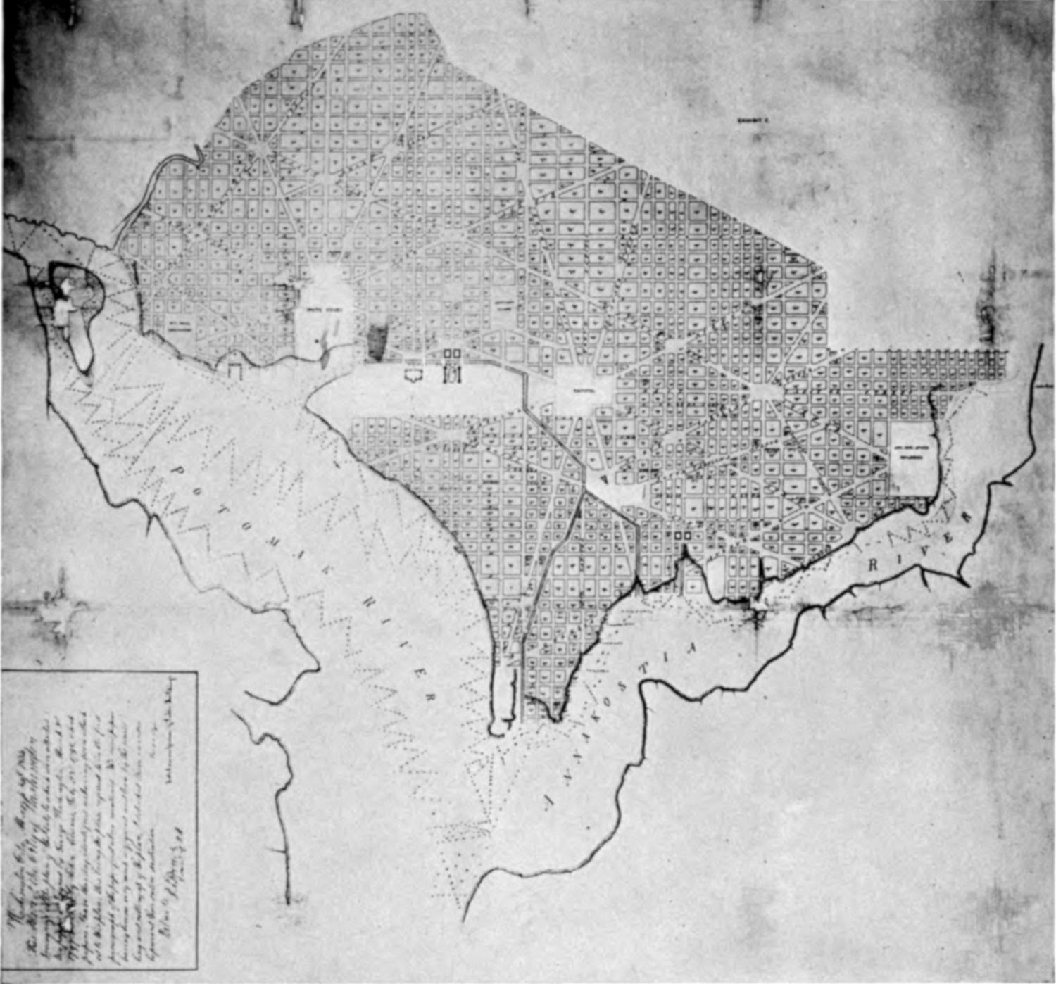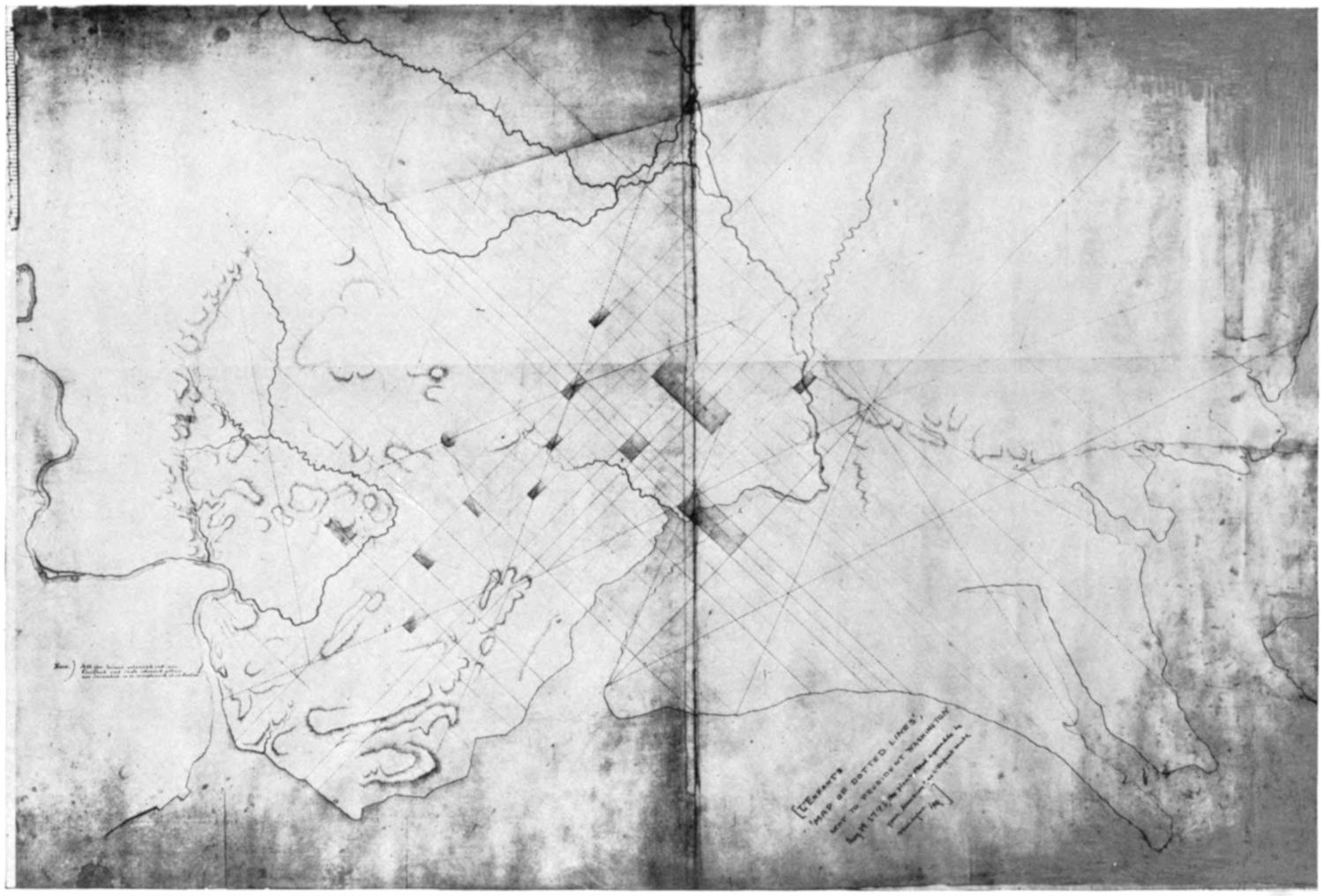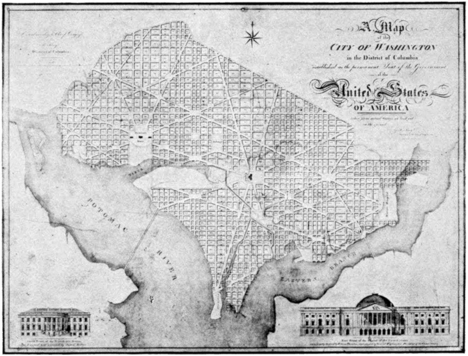 In order to execute this plan, Mr. Ellicott drew a true Meridional line by celestial observation, which passes through the Area intended for the Capitol; this line he crossed by another due East and West which passes through the same Area. These lines were accurately measured, and made the basis on which the whole plan was executed. He ran all the lines by a Transit Instrument, and determined the Acute Angles by actual measurement, and left nothing to the uncertainty of the Compass.