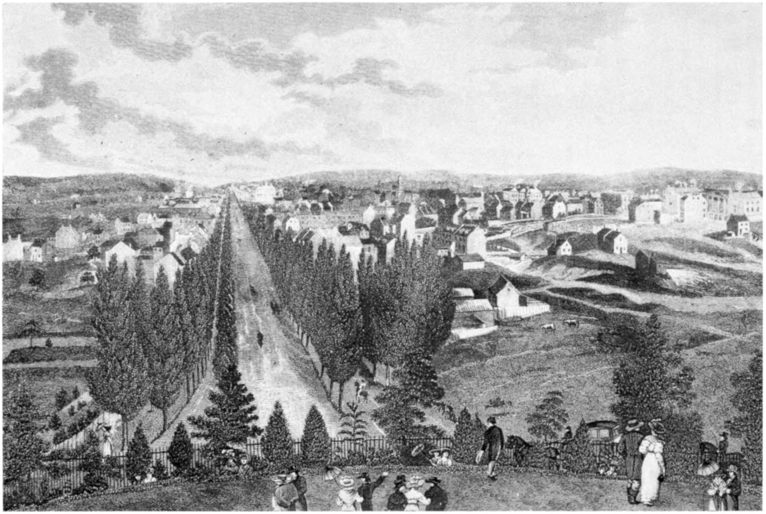 The grand Avenues, and such Streets as lead immediately to public places are from 130 to 160 feet wide, and may be conveniently divided into foot ways, walks of trees, and a carriage way. The other streets are from 90 to 110 feet wide.