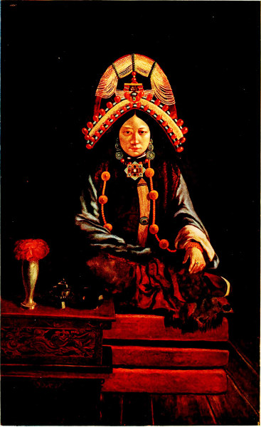 She wears two gold rings, one set with a turquoise, the other with coral. The peculiar crown of gold, turquoise and coral is that adopted for the queens of Sikkim. From the necklace of amber beads hangs a gau, or charm box, set with rubies, lapis-lazuli, and turquoise.