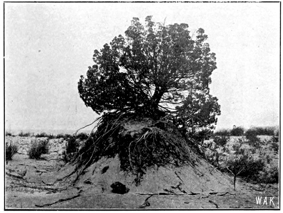 By no means the least interesting vegetation on Cedar Point are the dune plants, many species of arenophilous species, and efficient soil binders. Some idea of the appearance of a few of such plants may be gained from the cut (Fig. 2), which shows one of the sand hills held exclusively by the roots of the Red Cedar. Other similar hillocks are held by one of the wild grape vines, Vitis vulpina, and many other plants. The tufts of some of the grasses, especially Panicum virgatum, can be seen in the same illustration.