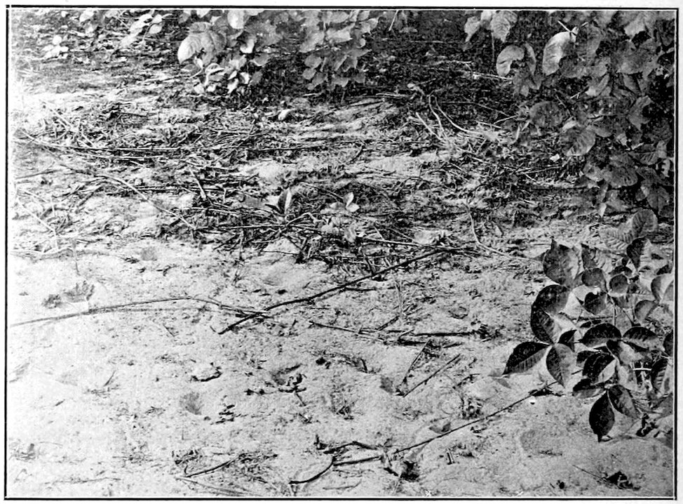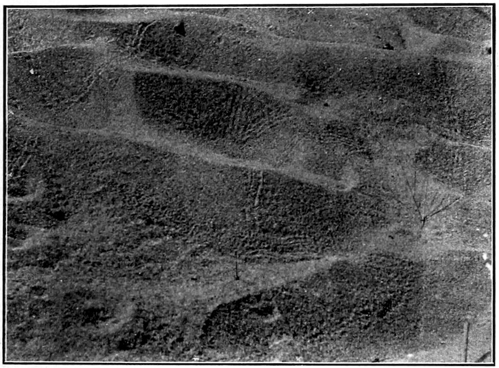 Ant Lion.—Still another very characteristic member of the dune fauna is the ant lion, the larvae of which construct their characteristic pitfalls in slightly protected places near bushes or trees, sometimes in great numbers, indicating a very numerous colony of these curious creatures. Of these there are, judging by the larvae, two quite distinct species common to the Point, but these have not as yet been reared. Aside from the pitfalls these ant lions make a peculiar track in the sand when they are moving from one point to another. These movements apparently occur only during short periods, as is shown when an area which has been entirely free from such tracks will be noticed after an hour or two to be completely netted with their devious furrows, which could only be formed by a number of larvae. The larvae move backward, and from the character of the furrows produced in the sand, must remain just beneath the surface of the sand, as the sand is raised on either side. That the furrows are formed by these larvae is proven by the fact that if the pitfalls at their ends be dug into they will be found to contain larvae. The movements of the larvae, forcibly produced, 89make lines like those observed. Pitfalls and furrows are illustrated in the accompanying plates, the furrows being quite indistinct, as they are not deep enough to produce distinct shade, and consequently do not show conspicuously in the photograph. Furrows are to be noted, however, in the figure (No. 3) above the points marked X.