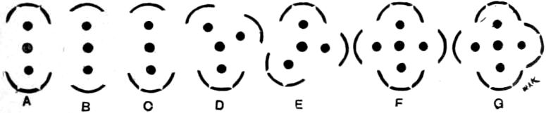 The number of flowers is normally three and the involucral leaves two. A diagram showing their arrangement is given at A, Fig. 1. The two leaves are not always ternate; they may both be simple, diagrammatically shown at B. A further variation, shown 108in Fig. 1 C presents one simple and one compound leaf. At D greater complexity is indicated, there being in many plants besides the central flower three instead of only two axillary ones, and only one of the subtending leaves is compound. In the case shown at E two of the three involucral leaves are compound. As shown in F and G four leaves may contribute to form the involucre and each one subtend a flower; in some cases two of the leaves are compound, in others three or even all may be compound. Still other variations along this line occur, but space forbids a fuller enumeration.