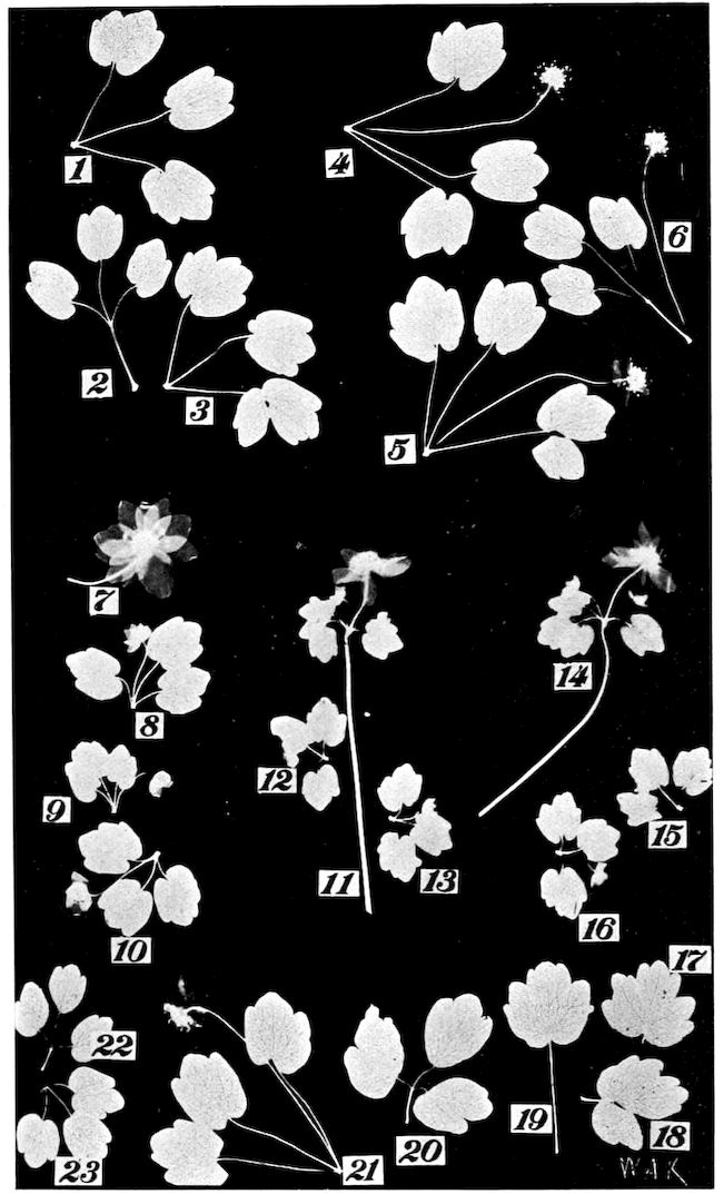 Explanation of Plate 9.—Syndesmon thalictroides; the leaves, etc., were used as negatives and the photographs were reduced by the engraver to less than one-half the natural size. Figs. 1, 2 and 3 show leaves from the same plant; figs. 4, 5 and 6 are from one and the same plant; figs. 7, 8, 9 and 10 are parts of the same plant; figs. 11, 12 and 13, also 14, 15 and 16 are each of one plant respectively; figs. 17 to 23 inclusive illustrate leaf variation, specimens taken from different plants, except figs. 22 and 23 which are from one and the same plant.