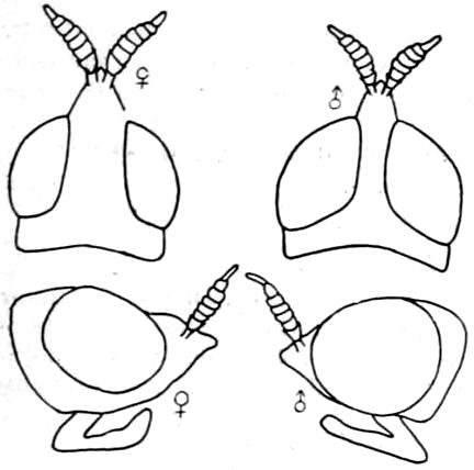 Head conically produced. Front in the female noticeably wider than the eye, in the male about half as wide as in the female. Antennae three-jointed, first and second joints about equal in length, third much longer than the other two together and composed of six rings. Posterior orbits wide in both sexes, but widest in the female, scutellum without spines, four posterior veins arising from the discal cell, abdomen short and broad, nearly circular in outline.