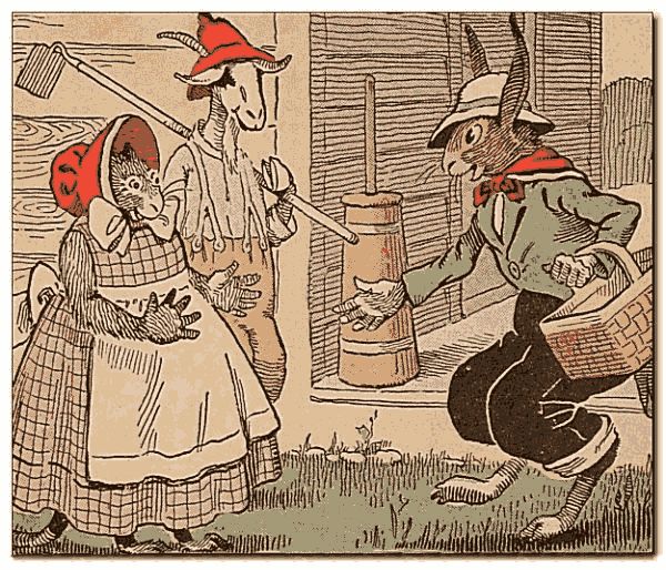 Uncle Wiggily and Nurse Jane Fuzzy Wuzzy went to pay a little visit to Uncle Butter the goat gentleman at the farm. Uncle Wiggily put on old clothes, and so did the muskrat lady. “For I am going to gather the eggs,” said Uncle Wiggily, hanging a basket on his paw, “and I may have to crawl under the barn to find them.” Nurse Jane told the bunny uncle to be careful. “While you are gathering the eggs I’ll do the churning,” said Miss Fuzzy Wuzzy. Uncle Butter was going to hoe the potatoes.