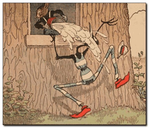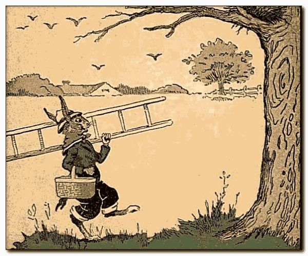 Uncle Wiggily walked around looking for eggs and, all of a sudden he saw a nest up in a tree. “Oh my!” exclaimed the bunny gentleman. “That hen has laid her eggs so high up I’ll have to bring a ladder to get them down.” So Uncle Wiggily hunted around until he found a ladder and then, saying nothing to Nurse Jane or Uncle Butter the goat, the bunny rabbit gentleman started to climb the tree to gather the eggs from the nest. Only he didn’t know just what kind of a nest it was.