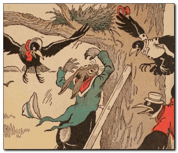 Uncle Wiggily climbed up the ladder to gather eggs, thinking he was helping Uncle Butter, when, all of a sudden a lot of black crows came flying through the air. “Caw! Caw! Caw!” cried the crows. “Please leave our eggs alone, Uncle Wiggily!” And they flew at the bunny gentleman so hard that he had to hold his paws over his ears to save his souse. “Oh, excuse me!” said the bunny to the crows. “I did not mean to take your eggs. I thought these were high hens’ eggs.”