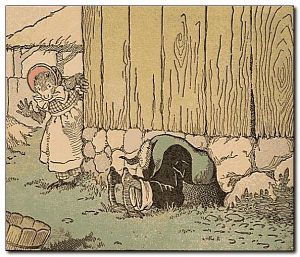 Uncle Wiggily begged the pardon of the crows, for having mistaken their nest for one with hens’ eggs in, and then, climbing down the ladder, Mr. Longears hopped along until he came to the barn. He saw a hen lady go under the barn. “Ah ha!” thought the rabbit uncle. “There must be eggs there! I’ll crawl under and see.” So Uncle Wiggily crawled under the barn, and when he was half way through the hole, along came Nurse Jane. “Mercy sakes, Wiggie! What are you doing?” asked the muskrat lady.