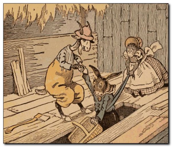 “My goodness me sakes alive and some strawberry lollypops!” cried the bunny rabbit gentleman, as he came home to his hollow stump bungalow. “What are you doing, Nurse Jane?” The muskrat lady said she was doing the fall house cleaning. “Then it is time I helped you,” said the rabbit gentleman. “It is not right that I should be off having fun, looking for adventures, while you work here at home. I’ll get on my old clothes and help you. I have had no adventures today. Now I may get one or two.” And just you wait.