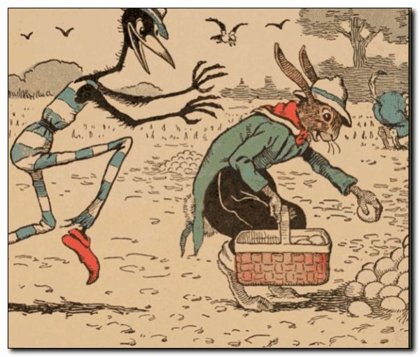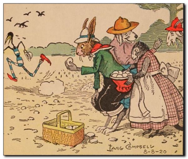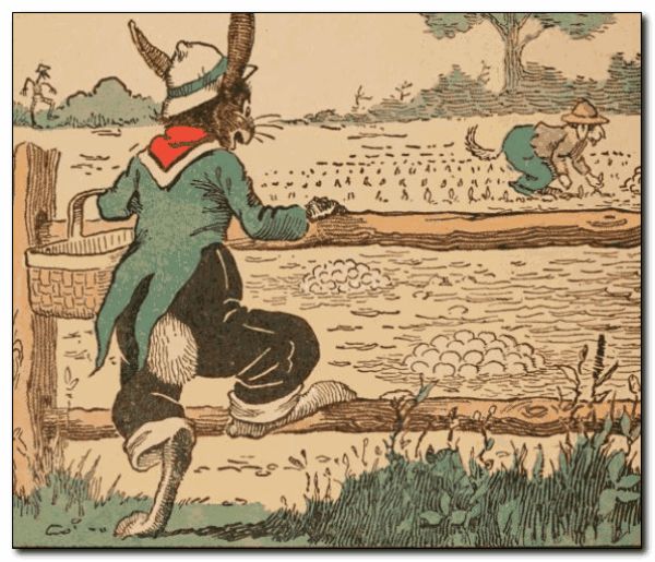 Uncle Wiggily hopped over the fence into the field where, in the far corner, Old Dog Percival was working. Uncle Wiggily began to fill his basket with what he thought were eggs that had been pulled out of the ground. You see Mr. Longears did not know much about a farm. All of a sudden the bad old Skeezicks sneaked up behind Uncle Wiggily. “This is the time I get his souse!” howled the bad chap, as he reached out his claws to grab Uncle Wiggily by the ears. “Look out! Look out!” cawed the friendly crows.