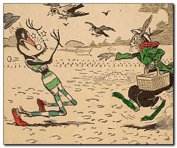 Uncle Wiggily looked up just as the good crows cried “Caw! Caw! Caw!” The bunny gentleman saw the Skeezicks about to grab for some ear souse. “Oh, what shall I do?” cried Uncle Wiggily. “How can I drive the Skee away?” The crows told the bunny to throw something at the Skee. “But I have only eggs, which Percival dug,” said the bunny. “Ha! Ha!” laughed the crows. “Those are not eggs—they are hard turnips. Throw them at the Skee!” Uncle Wiggily did, hitting him on his soft and tender nose.