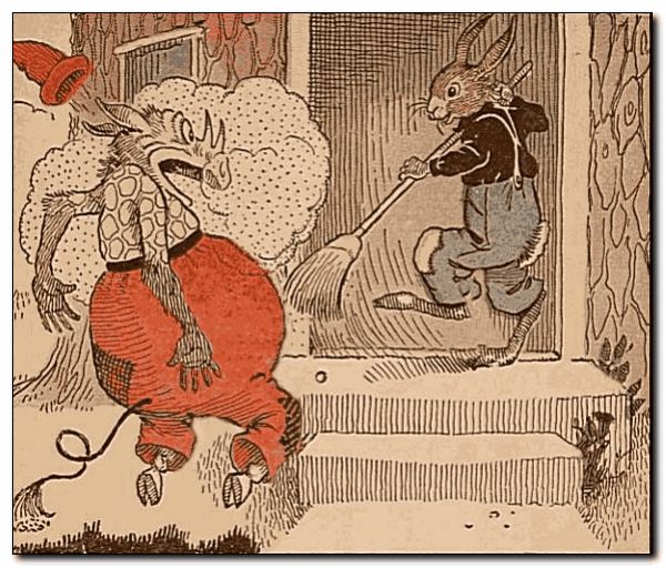Nurse Jane said it was very kind of Uncle Wiggily to wish to help her. So, after he had put on old clothes, he began to sweep. And just about this time the Pipsisewah, who was going to be the first to try to get the bunny’s souse, rushed up to the hollow stump bungalow. “Now I’ve got you!” cried the Pip to Uncle Wiggily, but the brave rabbit gentleman, with the broom, swept such a cloud of dust in the Pip’s eyes that the bad chap sneezed a back somersault, and had to run.