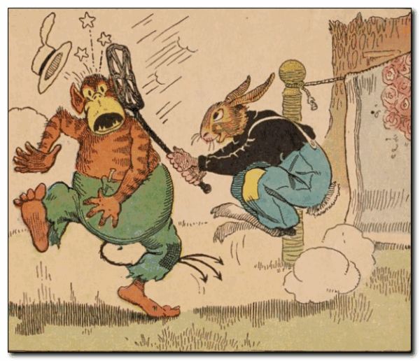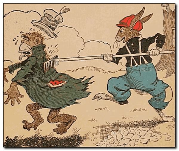 Away ran the Boozap, very sorry, indeed, that he had tried to get Uncle Wiggily’s souse. The bunny brought in the wood, and then said: “I will rake up the yard, Nurse Jane, and make it look nice over Sunday.” The muskrat lady thought that would be fine. But as Uncle Wiggily was raking up the fallen leaves and dried grass, all at once out at him jumped the Blue Nosed Babboon. “Souse I want and souse I must have!” howled the Bab. “Let me scratch your back with this rake!” laughed Uncle Wiggily.