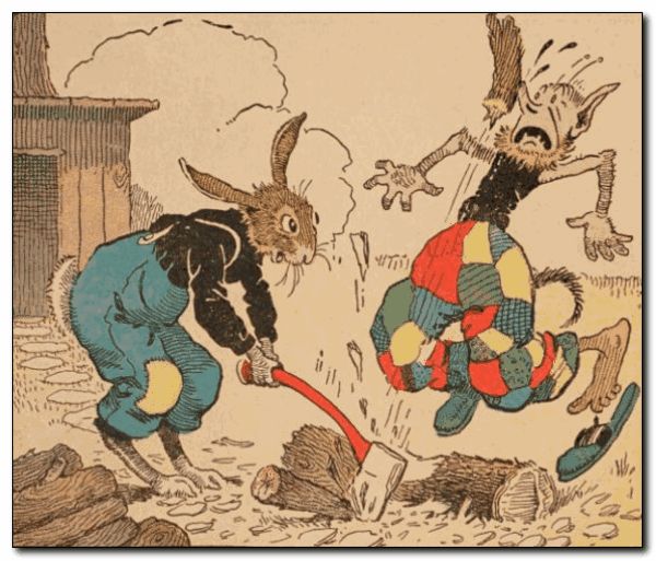 Uncle Wiggily beat the Skuddlemagoon so hard that the bad creature was glad enough to run away. “What do you want me to do next to help you, Nurse Jane?” asked the rabbit gentleman. “You might cut a little wood for the fire, so I can get supper,” answered the muskrat lady. So Uncle Wiggily took the axe and began to chop a stick. But, just as he gave a hard cut, the Boozap rushed up to try for some souse. And the end of the stick flew over and hit him on the nose. “Woe is me!” howled the Boozap.