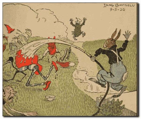 The fox ran back to the woods where the other bad animals were waiting. “Did you get some souse?” they asked. “No!” barked the Fox. “Uncle Wiggily is too smart for one of us at a time. We must all rush at him together.” So the bad animals tried this. But just then Uncle Wiggily began washing the stoop with the hose. And when he saw the six bad animals he turned the hose on them, and the water got in their eyes and noses and mouths and drove them away. So Uncle Wiggily’s souse was saved.
